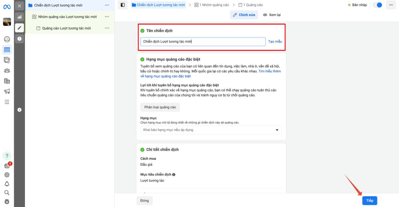 - Thiết lập tên chiến dịch và nhấnTiếp.
