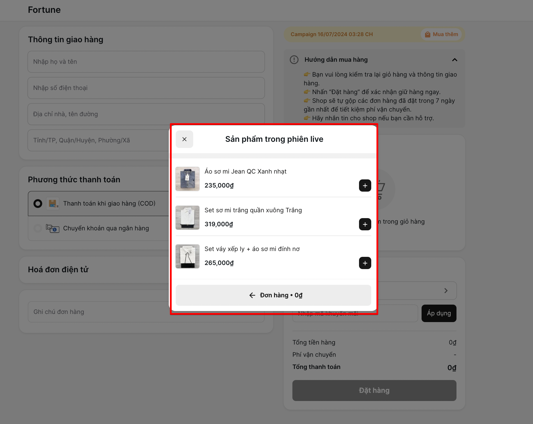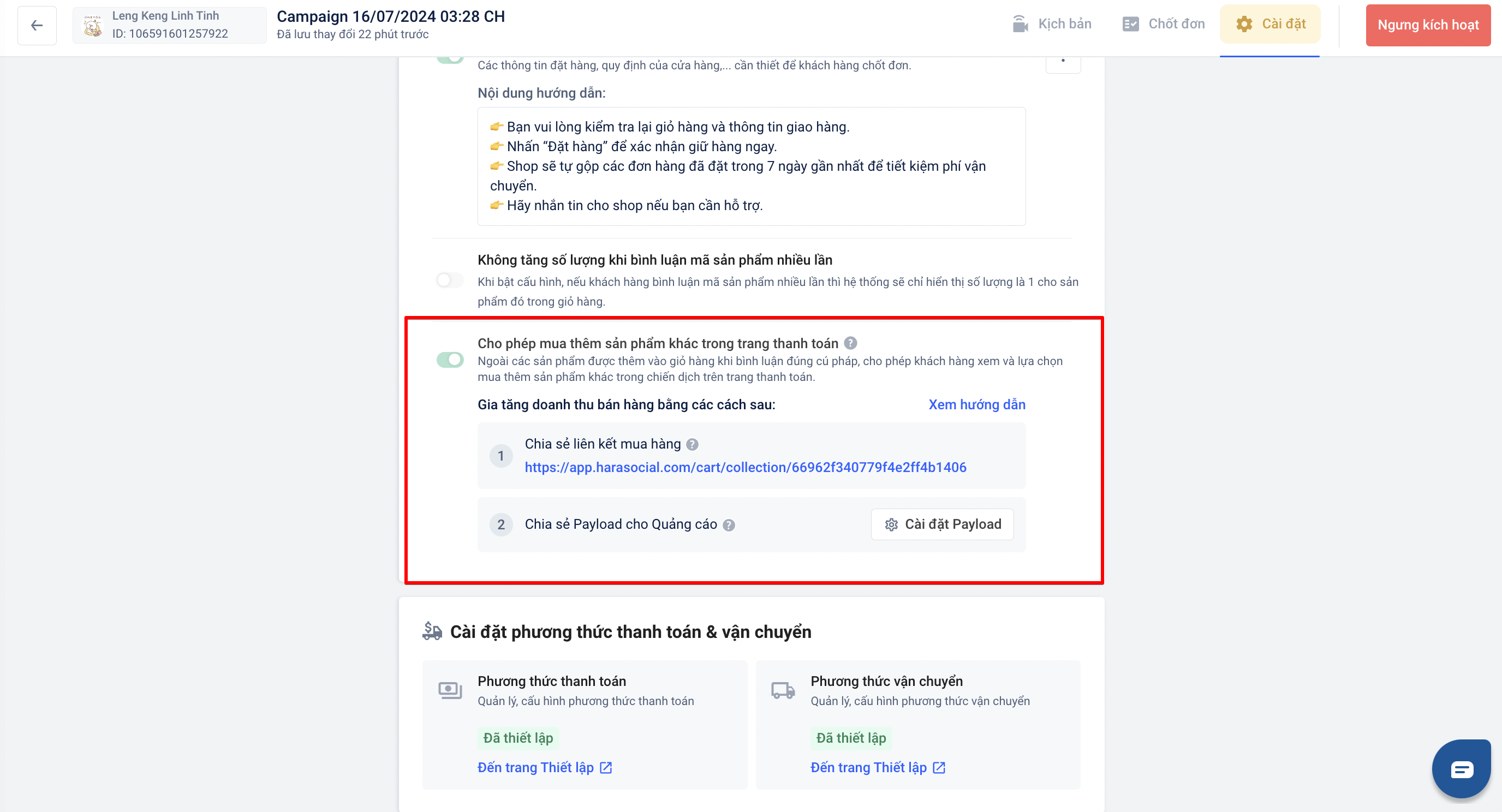 Đầu tiên khi kích hoạt chiến dịch tại công cụLivestream hoặc Tin bán hàng, hệ thống sẽ hiển thị nút kích hoạt mua thêm tại trang thanh toán.