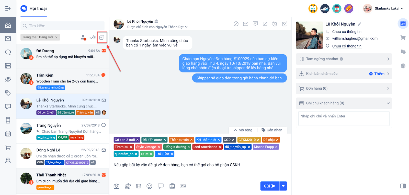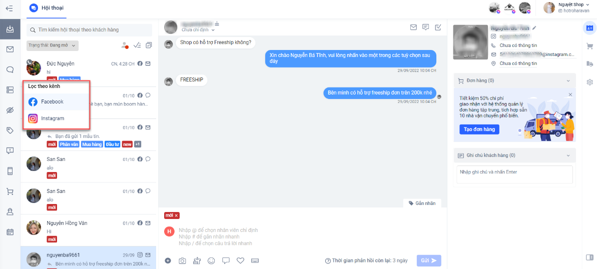 - Lọc theo các hội thoại có đơn hàng.