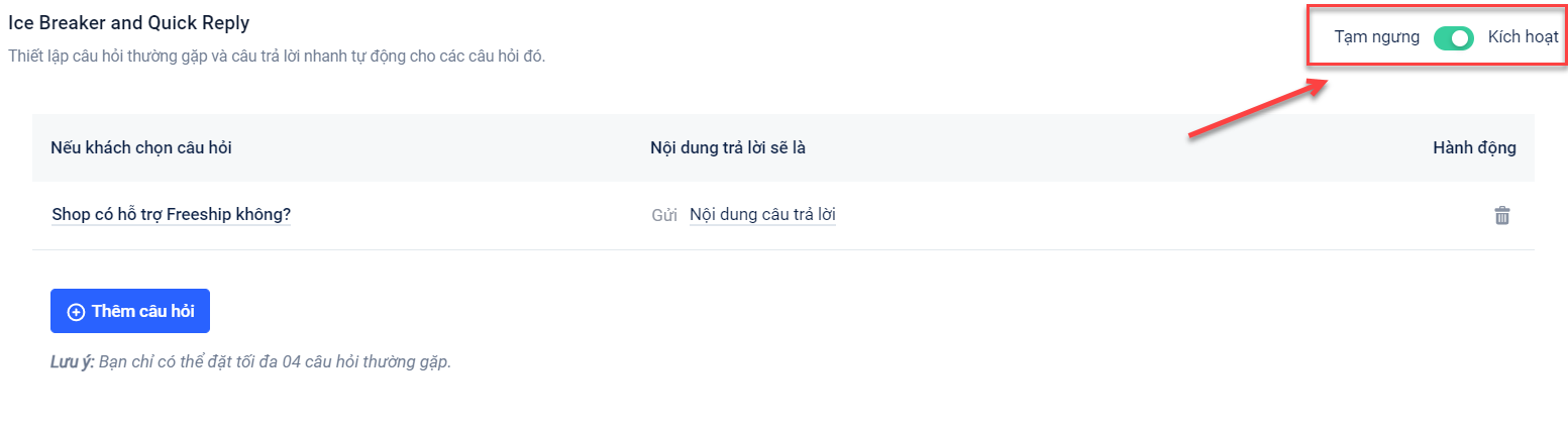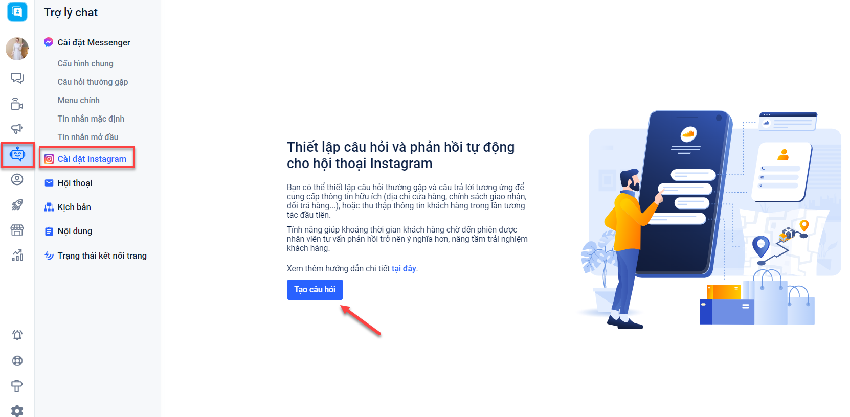 Để thiết lập, bạn vào Trợ lý chat → Cài đặt Instagram → Bấm "Tạo câu hỏi":