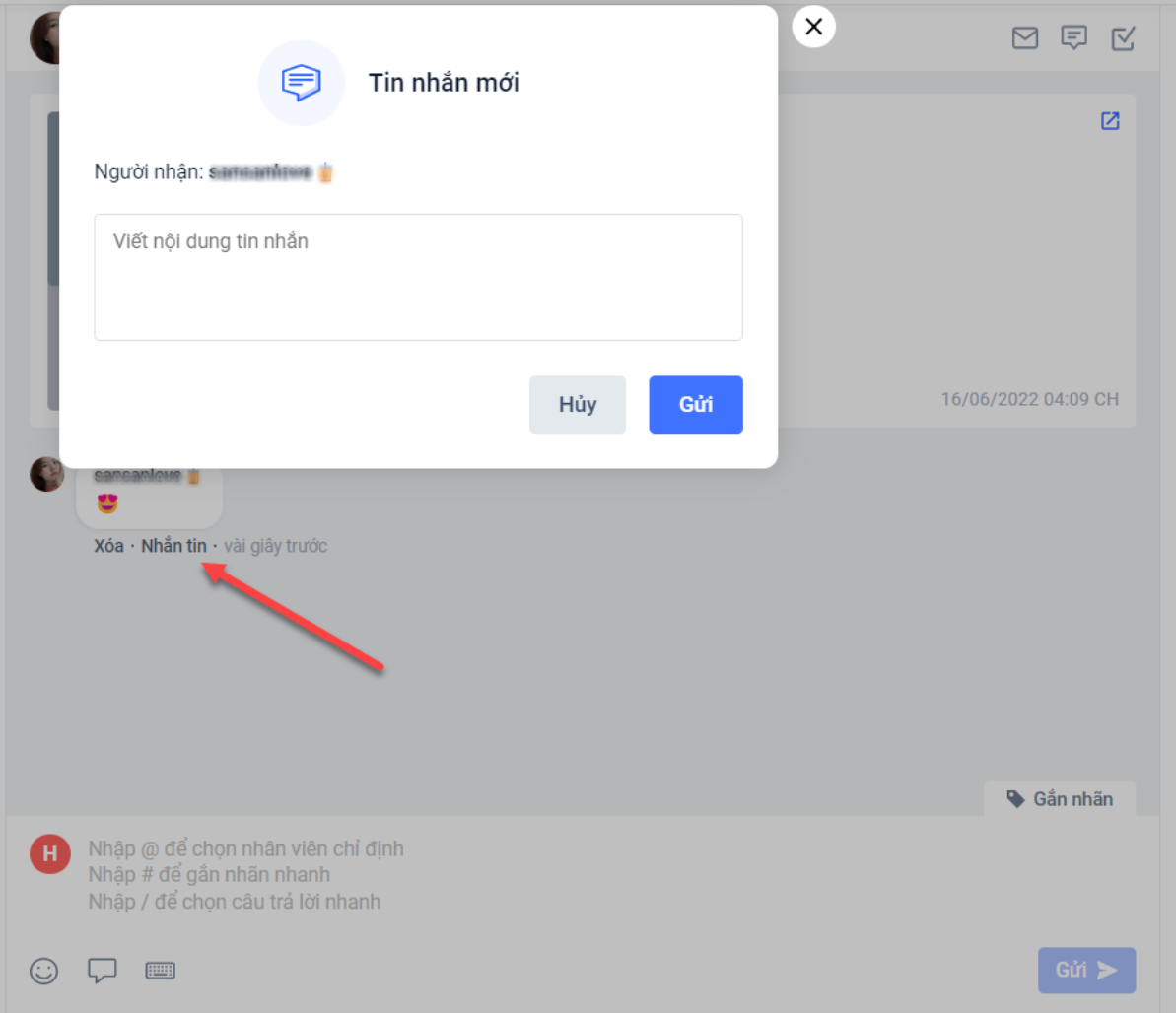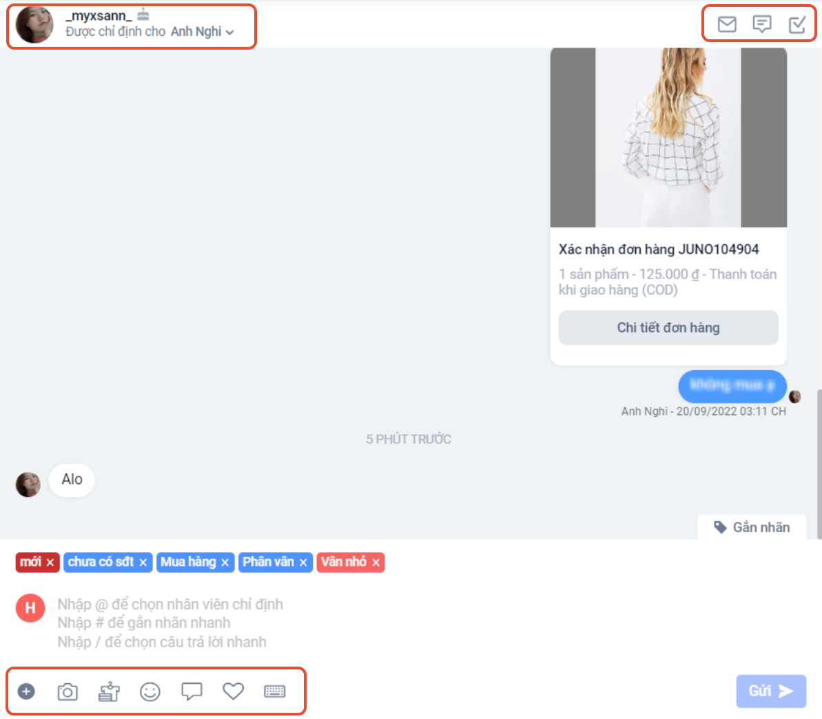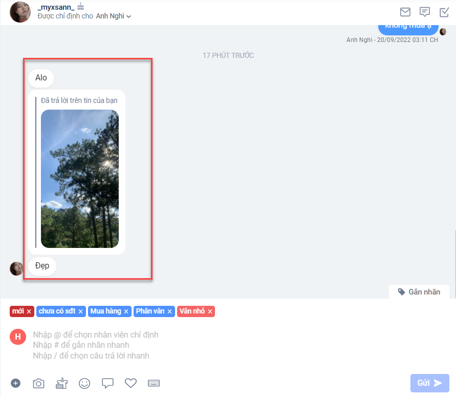 a. Nội dung chi tiết của 1 hội thoại và vùng soạn thảo của nhân viên:
