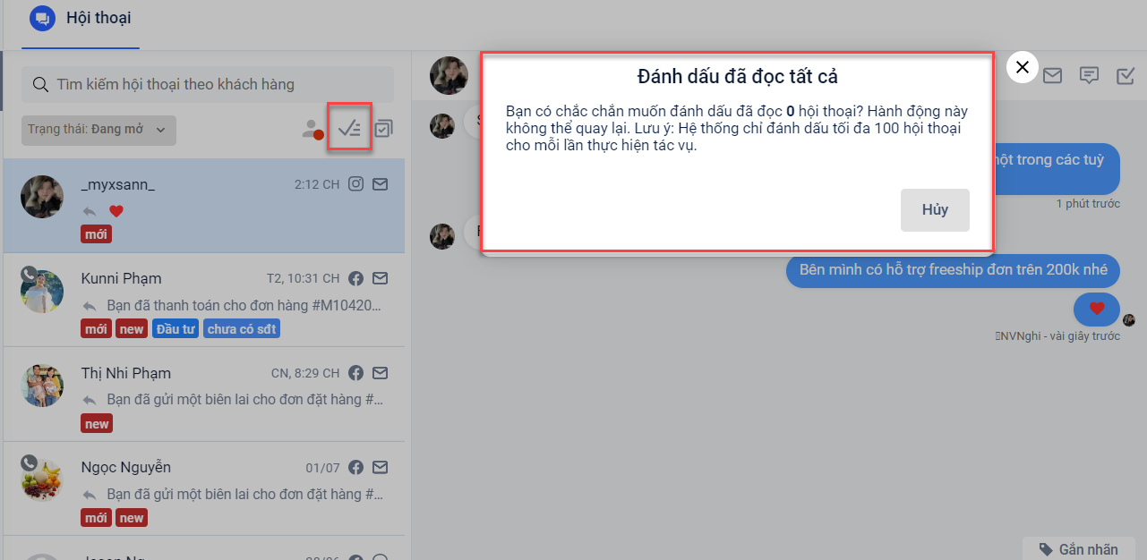 Khi nhấp vào nút “Đánh dấu đã đọc tất cả”, hệ thống sẽ hiển thị số lượng hội thoại sẽ được đọc. Nếu bạn đồng ý chỉ cần nhấn xác nhận đánh dấu là được.