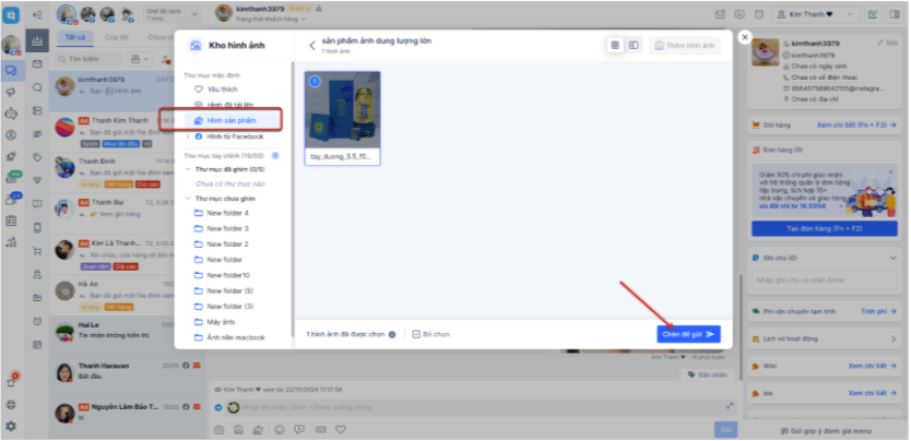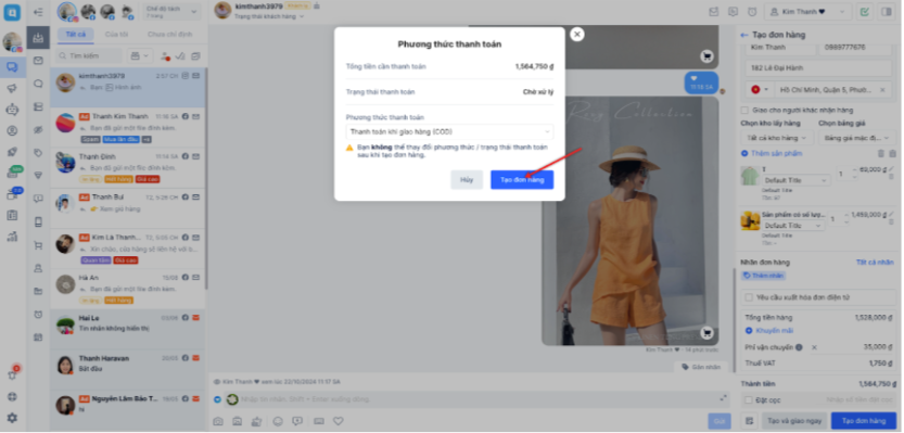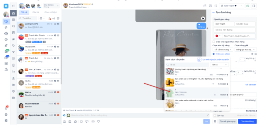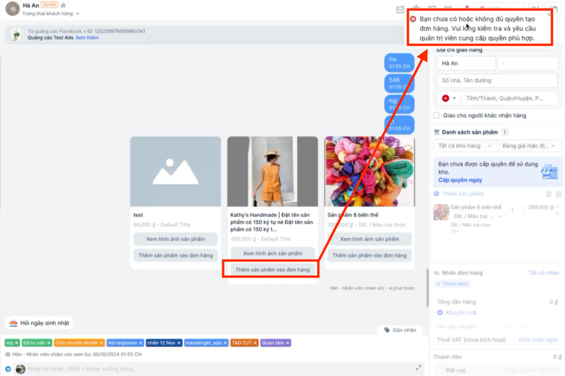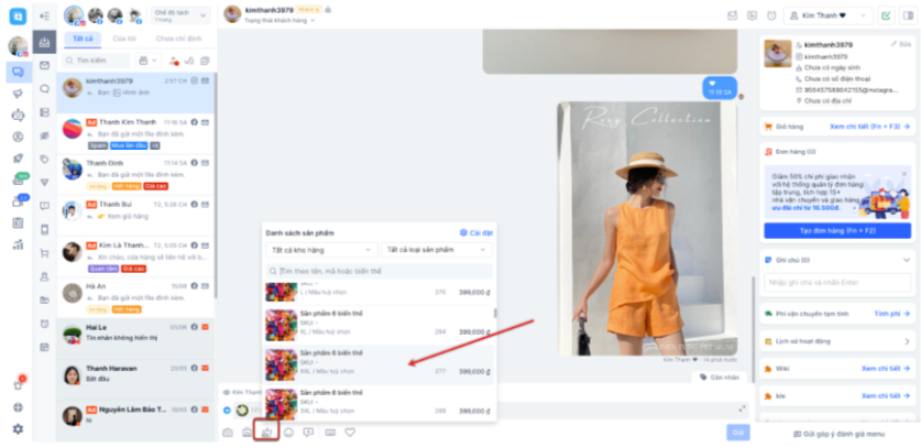 5.5.Tạo đơn nhanh trên hội thoại bằng nút "Thêm sản phẩm vào đơn hàng"