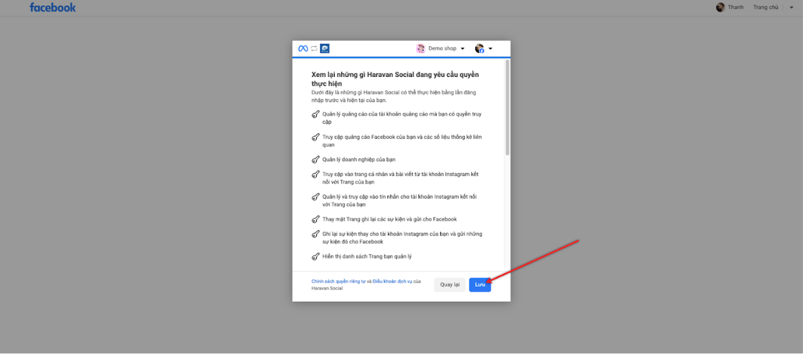 Bước 6: Thông tin các quyền mà Harasocial được cấp quyền sẽ hiển thị khi bạn liên kết tài khoản Doanh nghiệp với Harasocial. Bấm “Lưu” để hoàn tất kết nối sự kiện CAPI đối với kênh Instagram.
