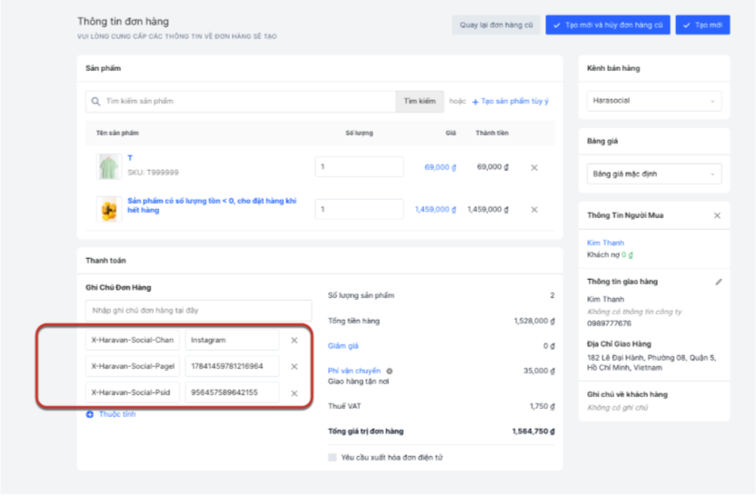 Đối với sự kiện “Chờ thanh toán” và sự kiện “Mua hàng”, khi tạo đơn từ Omni, cần có đủ các thông tin đơn hàng gồm kênh Harasocial, Page ID và PSID tương ứng của Trang đã kết nối với Dataset.