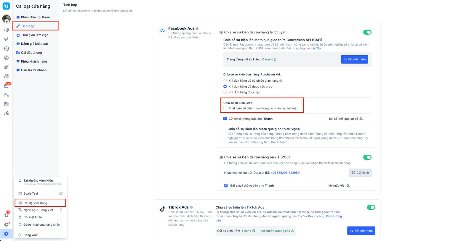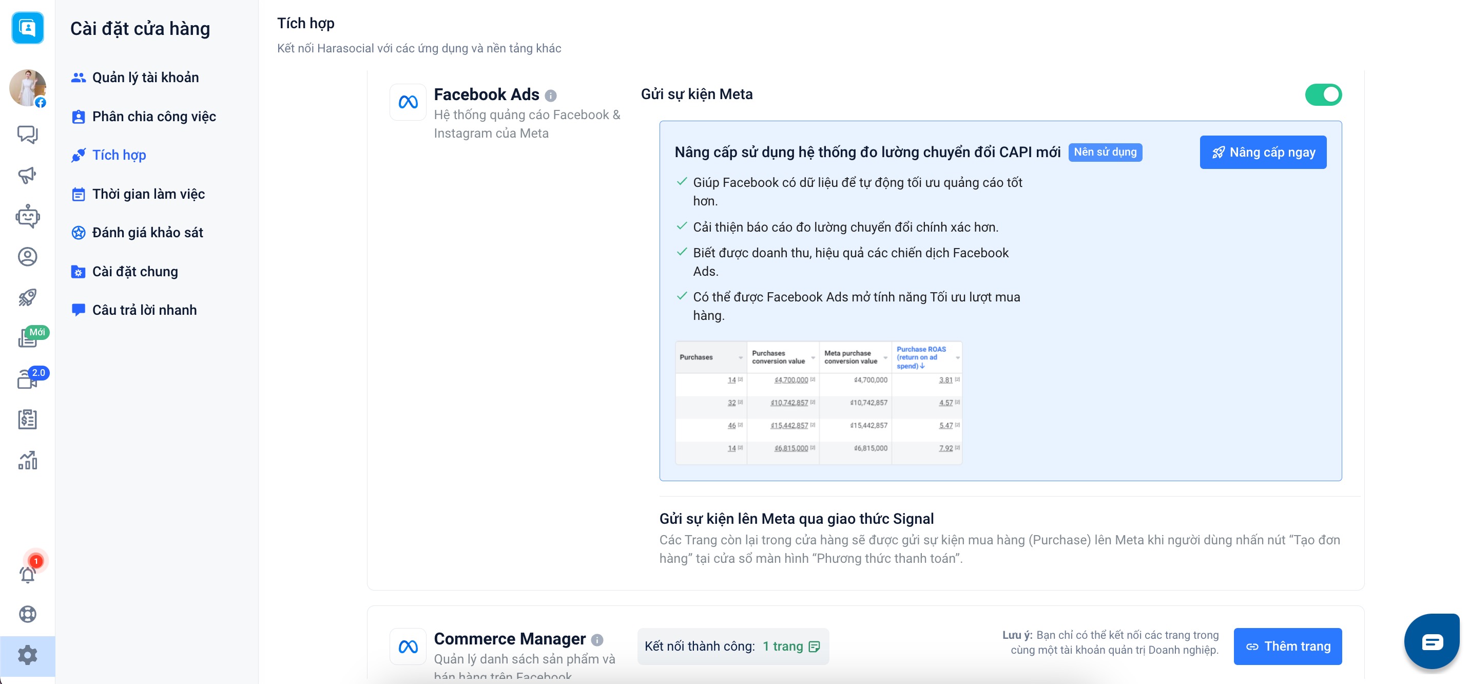 Sau khi hoàn tất kết nối, doanh nghiệp có thể xem lại các trang đã thêm tại mục “Tích hợp” trong “Cài đặt cửa hàng”.