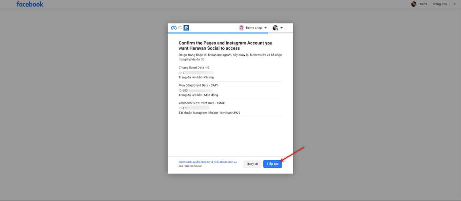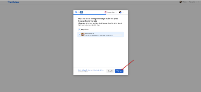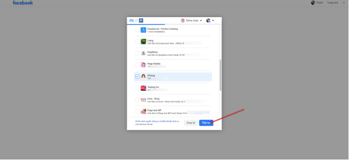 Nhấn “Tiếp tục” để đến pop-up chọn trang Facebook sẽ gửi kiện đến Meta.