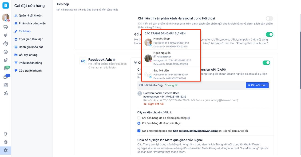 Xác nhận lại thông tin thiết lập kết nối gửi sự kiện CAPI giữa Meta và Harasocial.