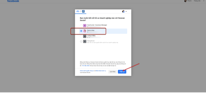 Bước 3: Doanh nghiệp sẽ được dẫn sang trang liên kết tài khoản Doanh nghiệp với ứng dụng HaraSocial. Tại đây, doanh nghiệp có thể chọn 1 tài khoản doanh nghiệp để kết nối API.