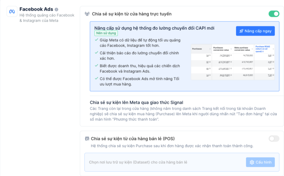 Hiện tại nút kích hoạt công cụ đấy sự kiên lên Meta sẽ được bật cho cả 2 phương thức CAPI và Signal. Trang nào kết nối CAPI thì gửi CAPI, các trang còn lại sẽ gửi sự kiện qua giao thức Signal, Signal chỉ áp dụng cho Facebook và không áp dụng cho Instagram.