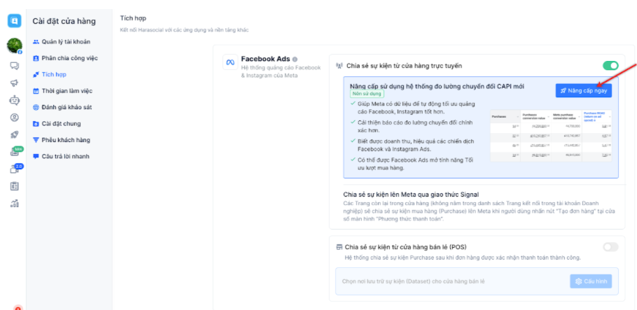 Bước 2: Tại mục “Chia sẻ sự kiện từ cửa hàng trực tuyến”, chọn “Nâng cấp ngay”.
