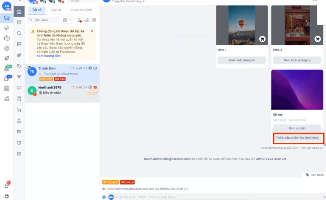 Chỉ áp dụng cho những tin nhắn được gửi ra từ ngày 31/10/2024, những hội thoại trước ngày này sẽ không hiển thị nút "Thêm sản phẩm vào đơn hàng".