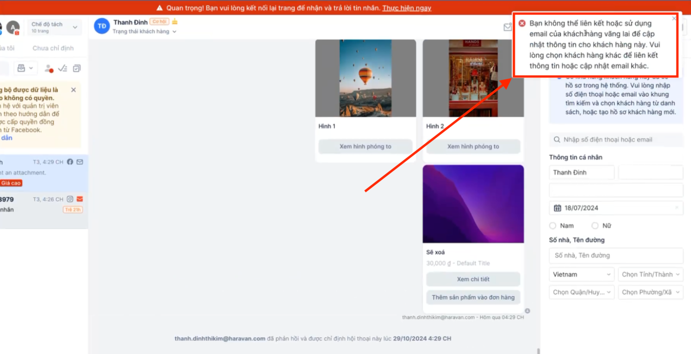 Khi thêm các sản phẩm không thuộc cửa hàng, không nằm trong chiến dịch, sản phẩm không có quyền kho thì hệ thống sẽ hiển thị pop-up báo lỗi.