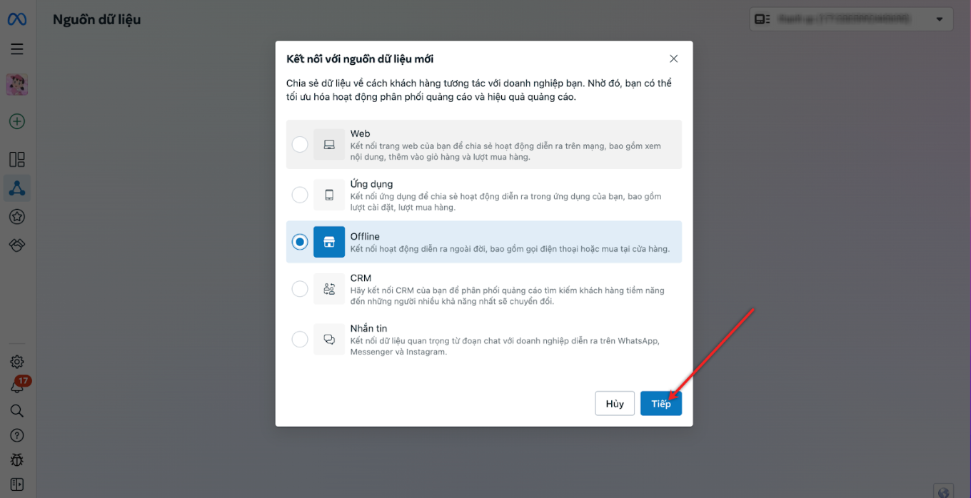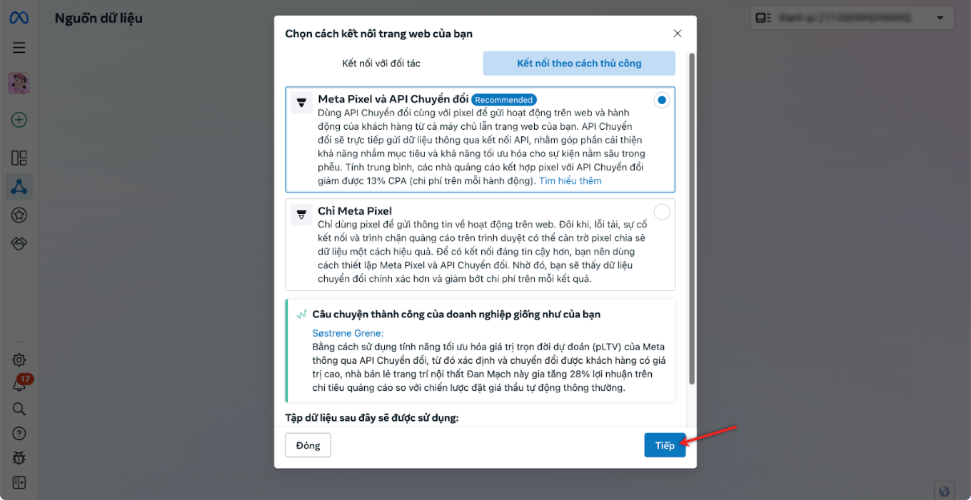 - Giữ lựa chọn mặc định tại mục **“Meta Pixel và API Chuyển đổi"**và bấm “Tiếp".