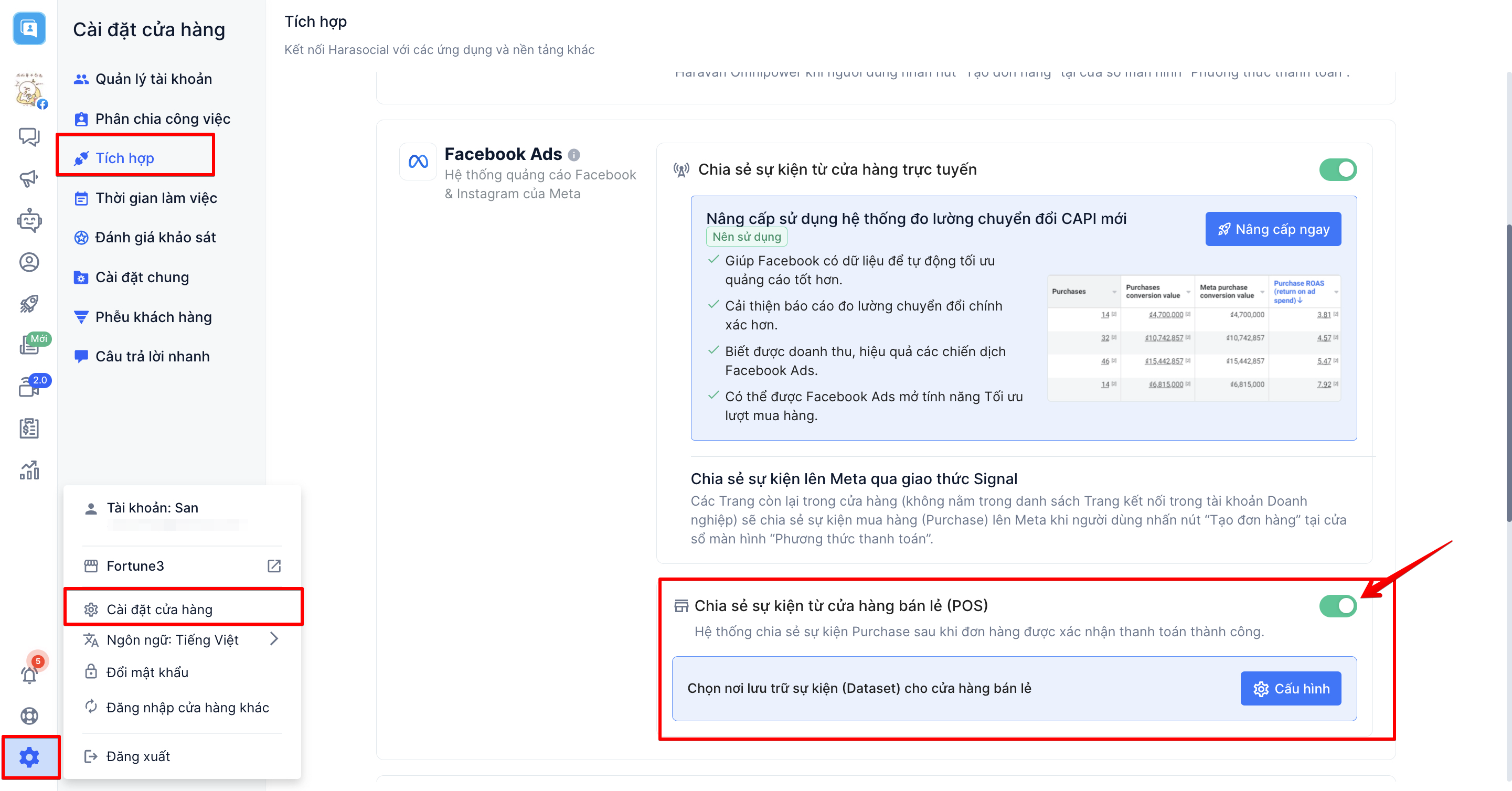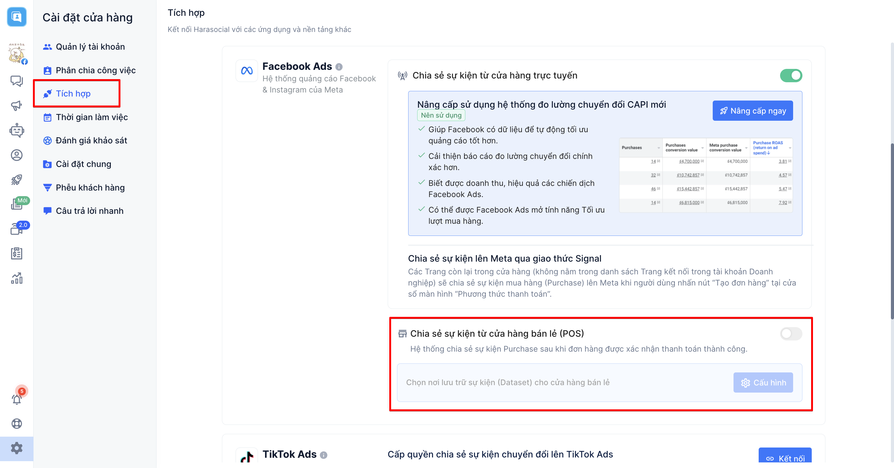- **Bước 1:**Bạn cần truy cập vào mục Tích hợp tại HaraSocialtại đây → sau đó bật kích hoạt công cụ "Chia sẻ sự kiện từ cửa hàng bán lẻ (POS)".