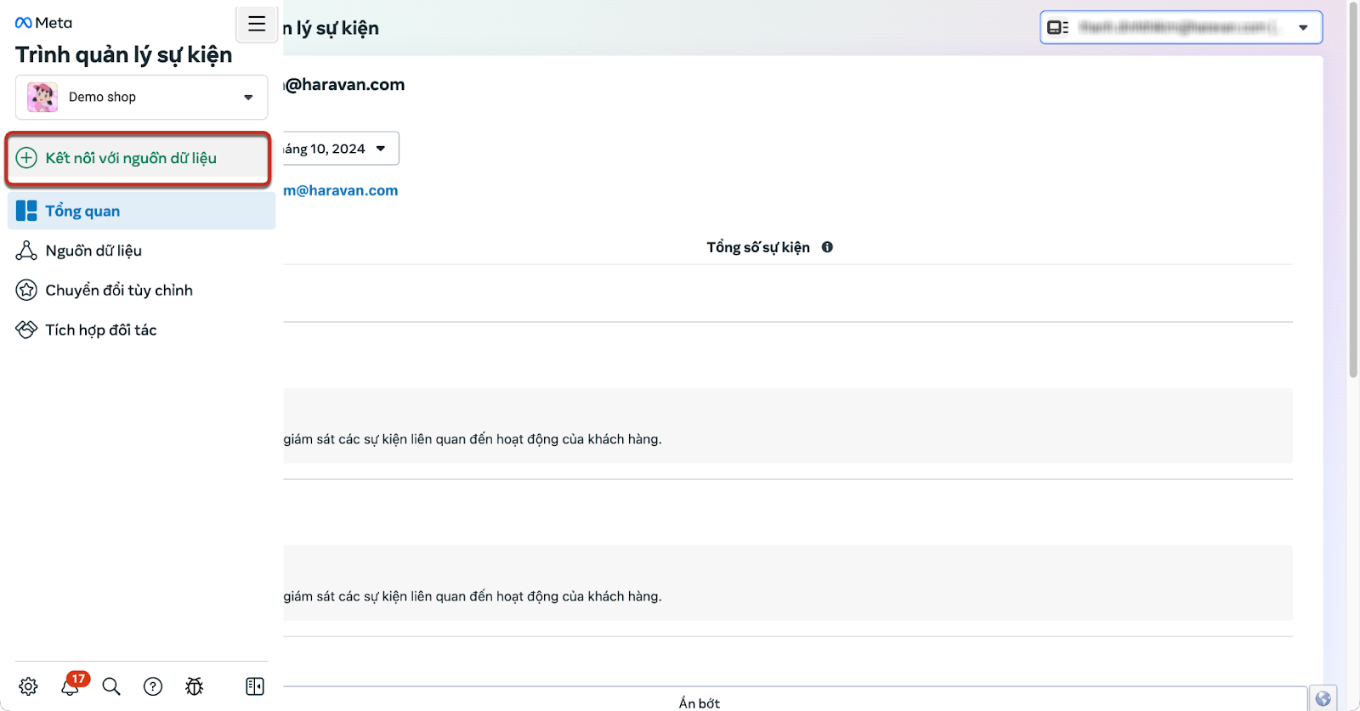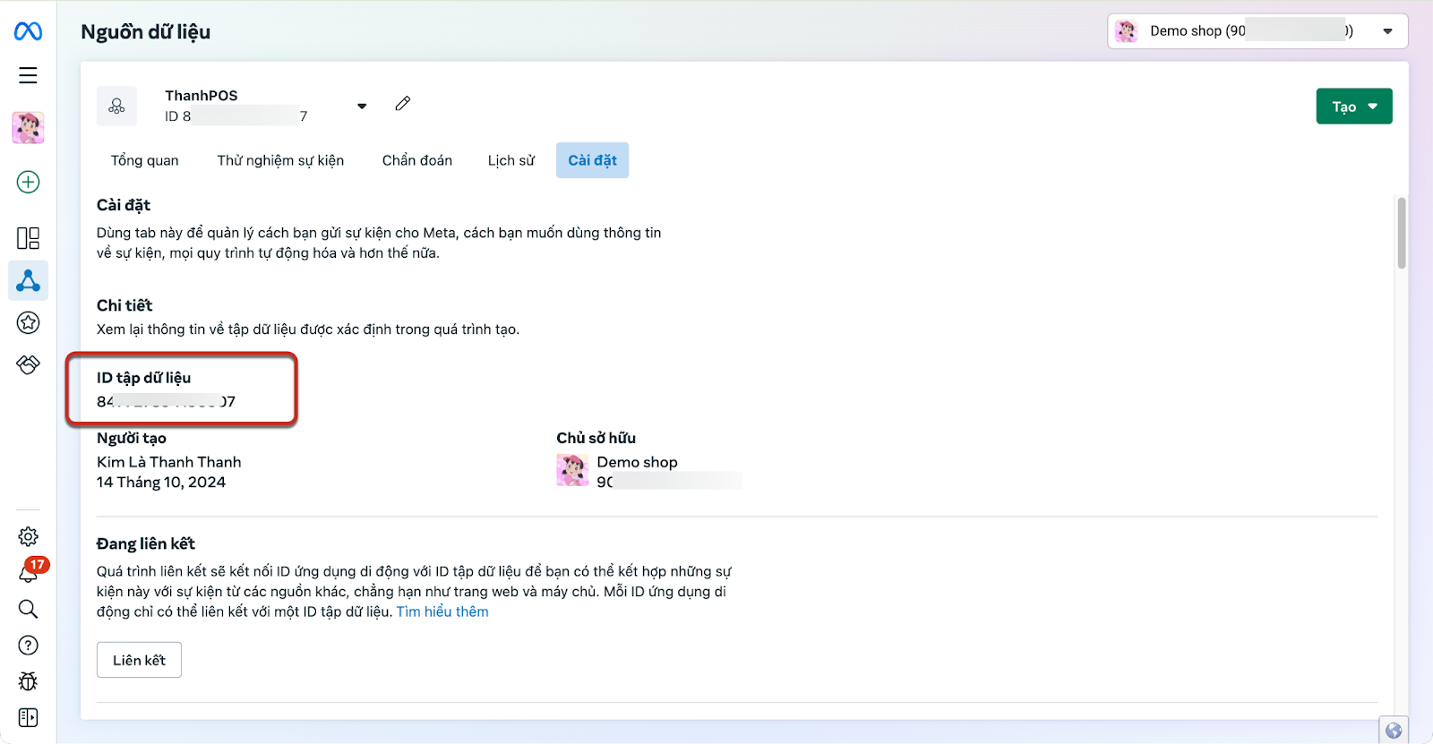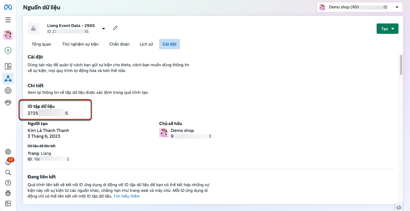 Dataset dùng để kết nối có thể không trùng Tài khoản Doanh nghiệp với Tài khoản Doanh nghiệp đã kết nối CAPI ở mục “Chia sẻ sự kiện từ cửa hàng trực tuyến”.