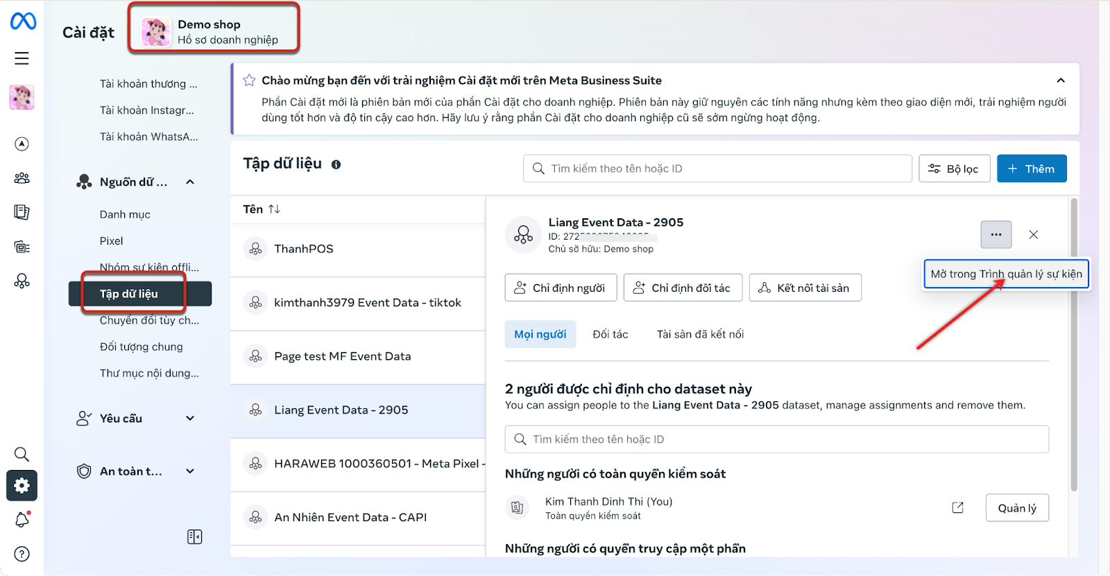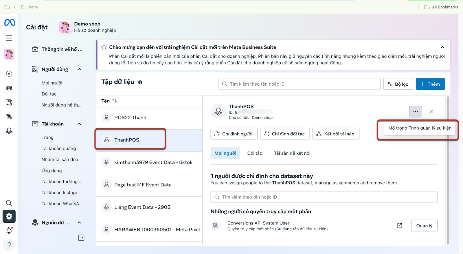 - Truy cập trang https://business.facebook.com/latest/settings/events_dataset? để xem thông tin Event set vừa tạo → sau đó chọn xem chi tiết và bấm vào**“Mở trong trình quản lý sự kiện".**