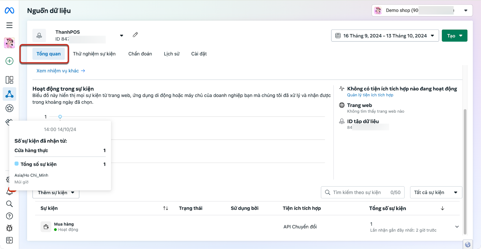 Để kiểm tra việc tạo đơn của bạn tại POS đã được gửi lên Dataset, bạn truy cập Dataset đã kết nối tương ứng https://business.facebook.com/events_manager2/list/dataset/ và mở mục**“Tổng quan"**. Tại đây bạn sẽ xem được các sự kiện khi được gửi lên.