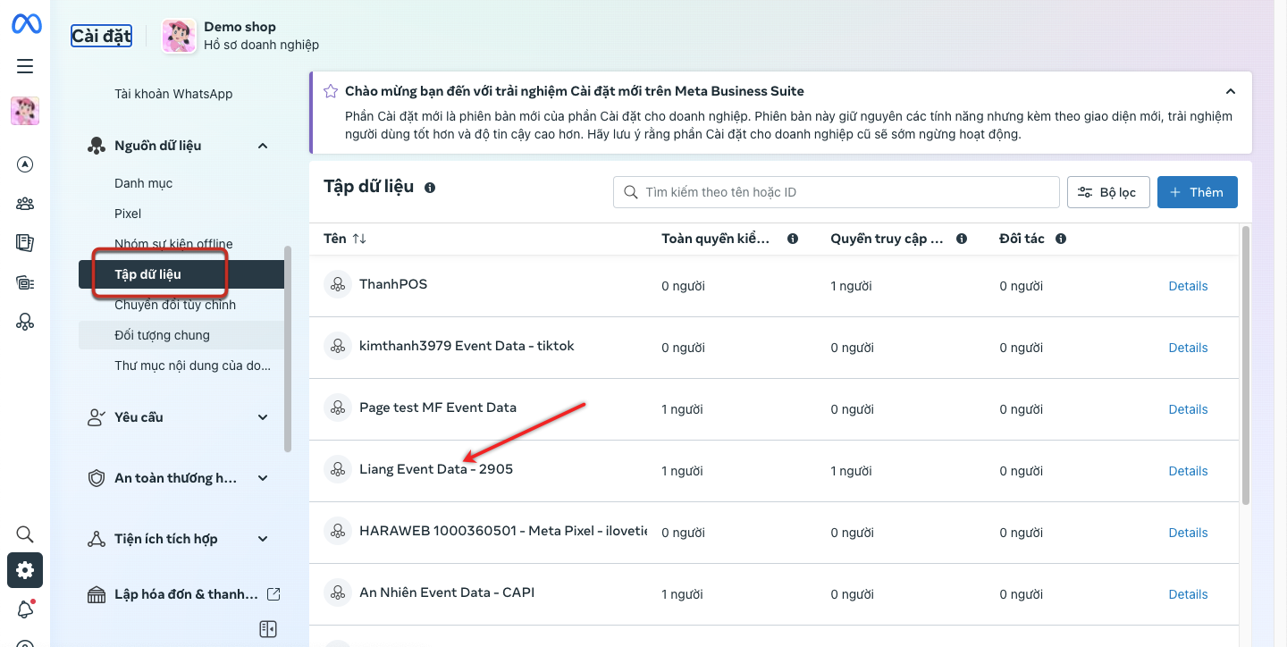- Vào Business Facebook → Chọn Hồ sơ doanh nghiệp muốn kết nối → Mở menu Cài đặt → Menu Nguồn dữ liệu → Menu Tập dữ liệu.