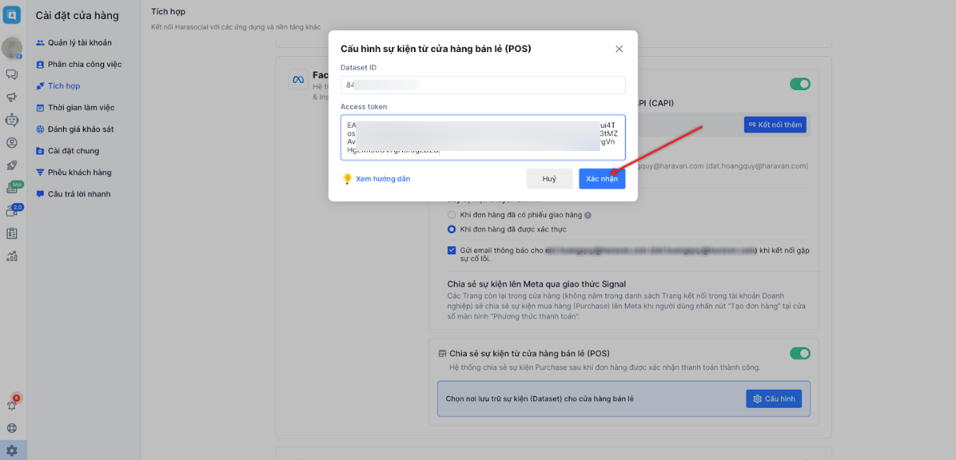- Bước 2:Chọn"Cấu hình" → sau đó nhập thông tinDataset IDvà mãAccess Token tương ứng đã lấy trên Facebook và nhấn**"Xác nhận"**.