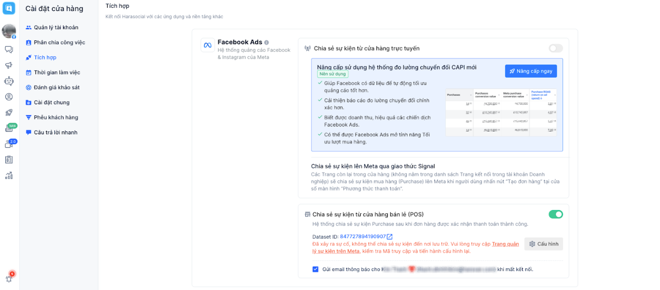 - **Bước 1:**Bạn cần truy cập vào mục Tích hợp tại HaraSocialtại đây → sau đó bật kích hoạt công cụ "Chia sẻ sự kiện từ cửa hàng bán lẻ (POS)".