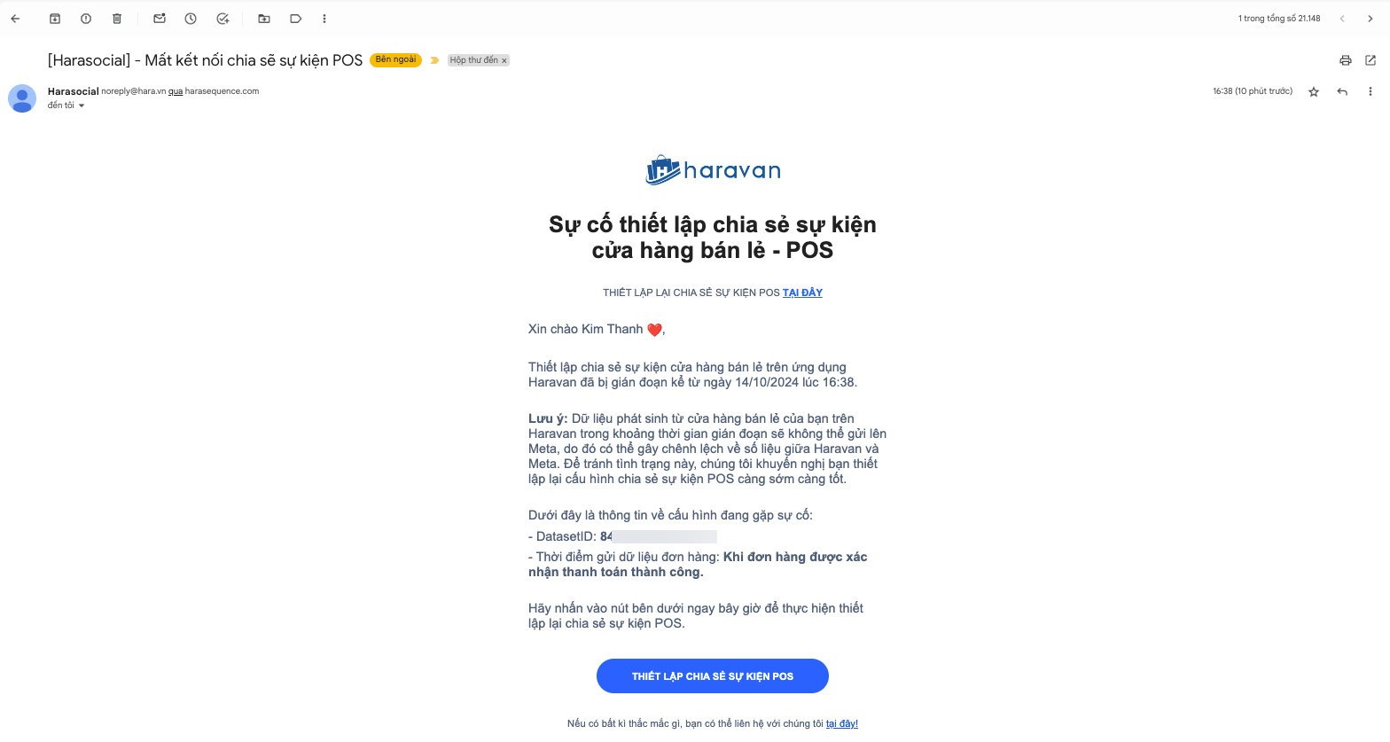 Lưu ý: Email “Sự cố thiết lập chia sẻ sự kiện cửa hàng bán lẻ - POS“**chỉ gửi 1 LẦN**, tại thời điểm khi có đơn hàng tạo từ POS thỏa điều kiện bắn event trên tài khoản đang có lỗi kết nối**“Chia sẻ sự kiện từ cửa hàng bán lẻ (POS)”.**