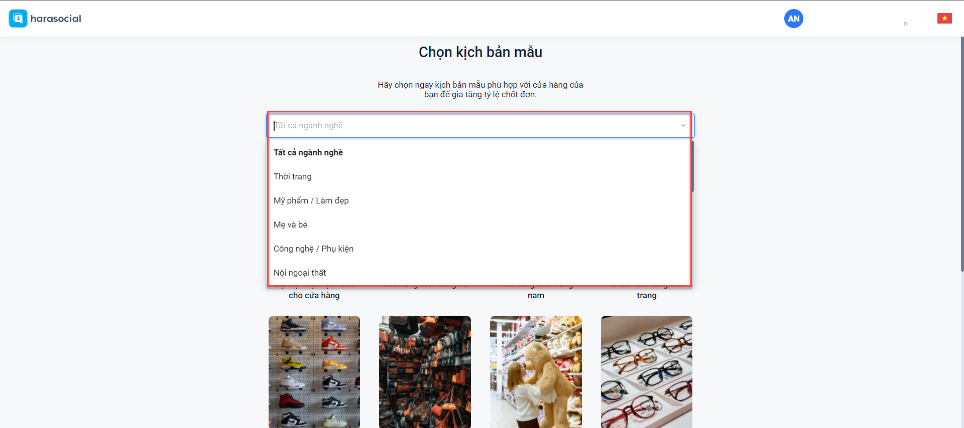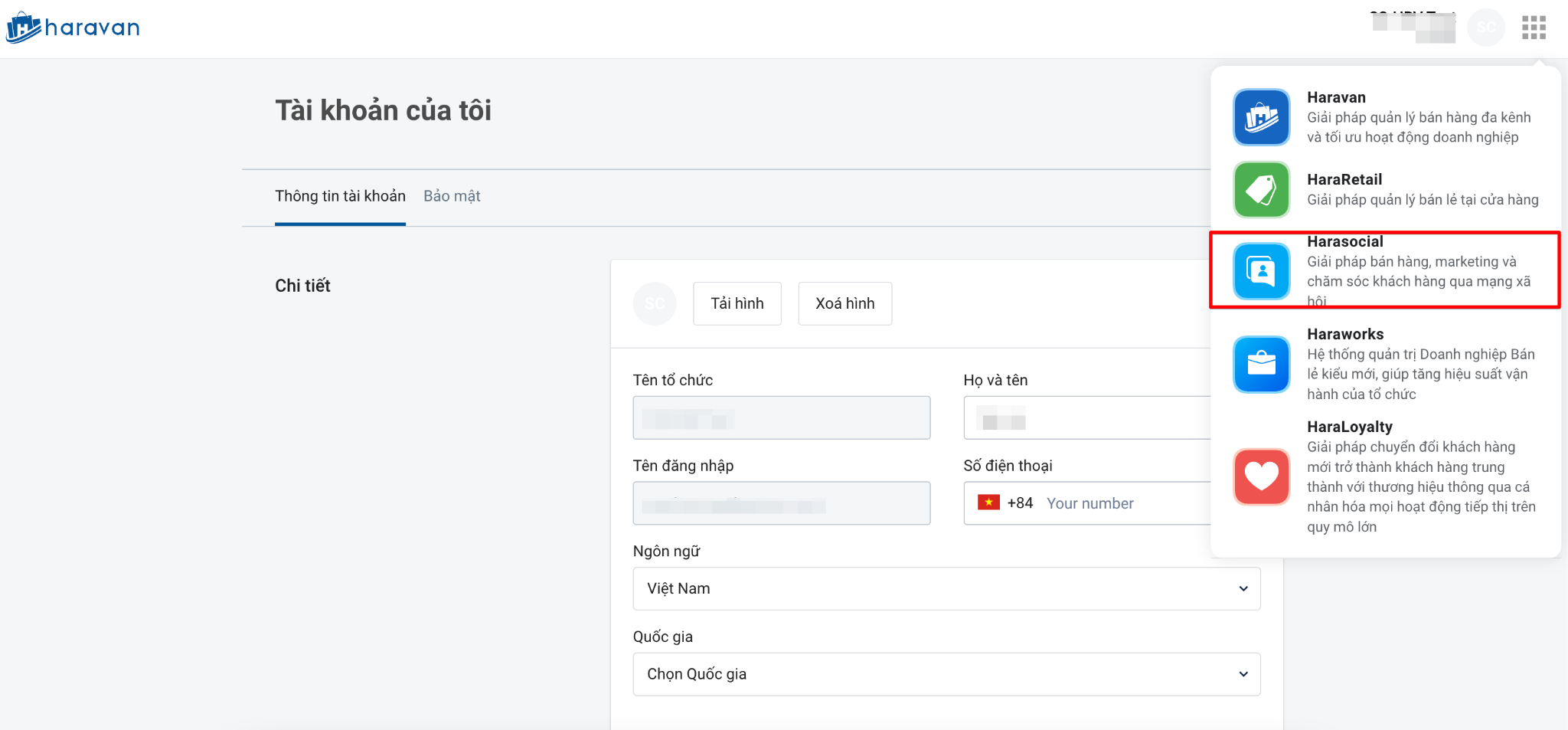 Khi đăng nhập hoàn tất, đây sẽ là nơi bạn quản lý tất cả tài khoản Haravan → tiếp đến bạn chọn kênh Harasocial để vào quản trị sử dụng