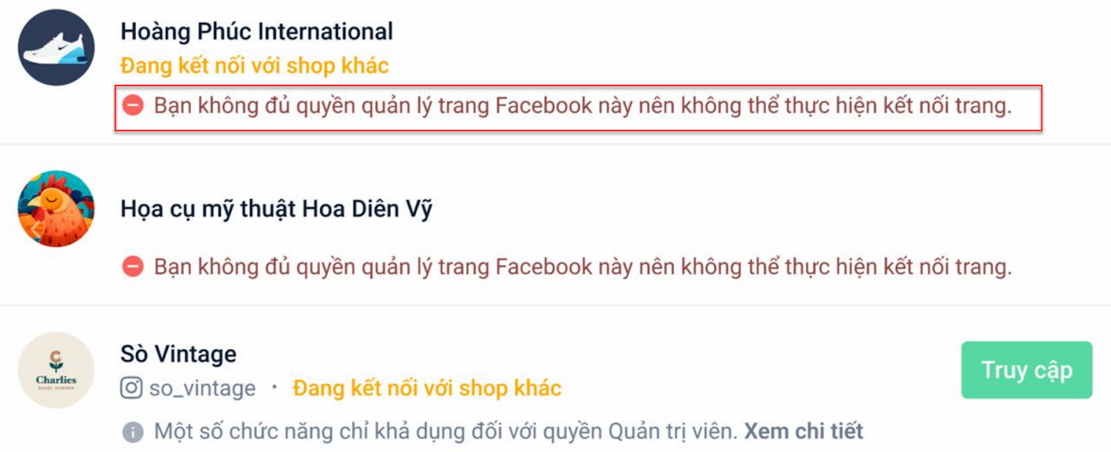 - Trong trường hợp bạn không có quyền quản lý fanpage Facebook thì hệ thống tiến hành hiển thị cảnh báo không thể kết nối: