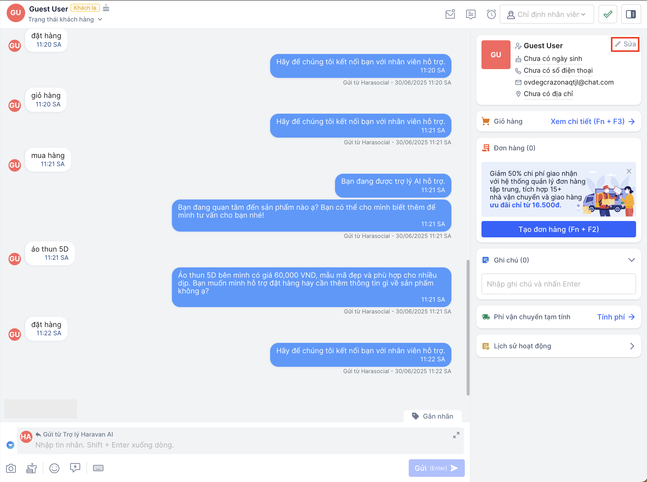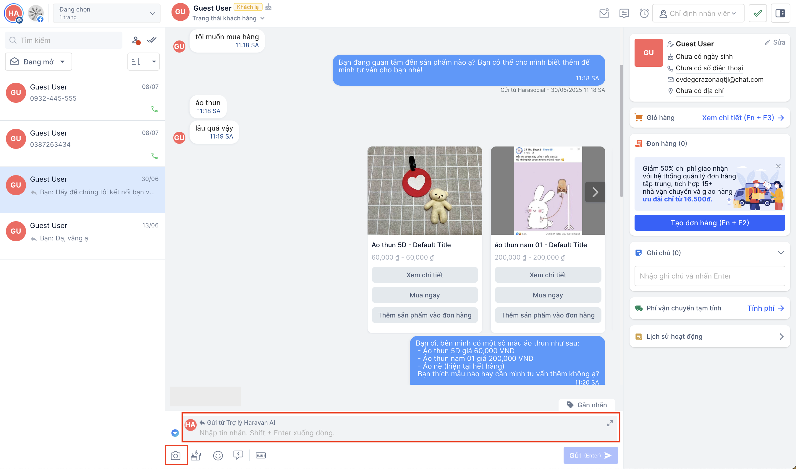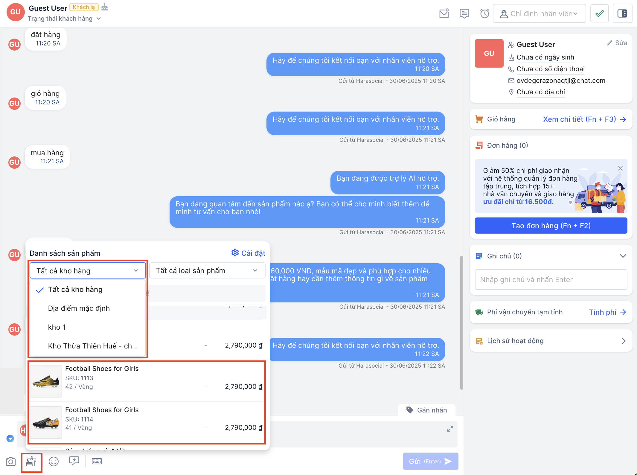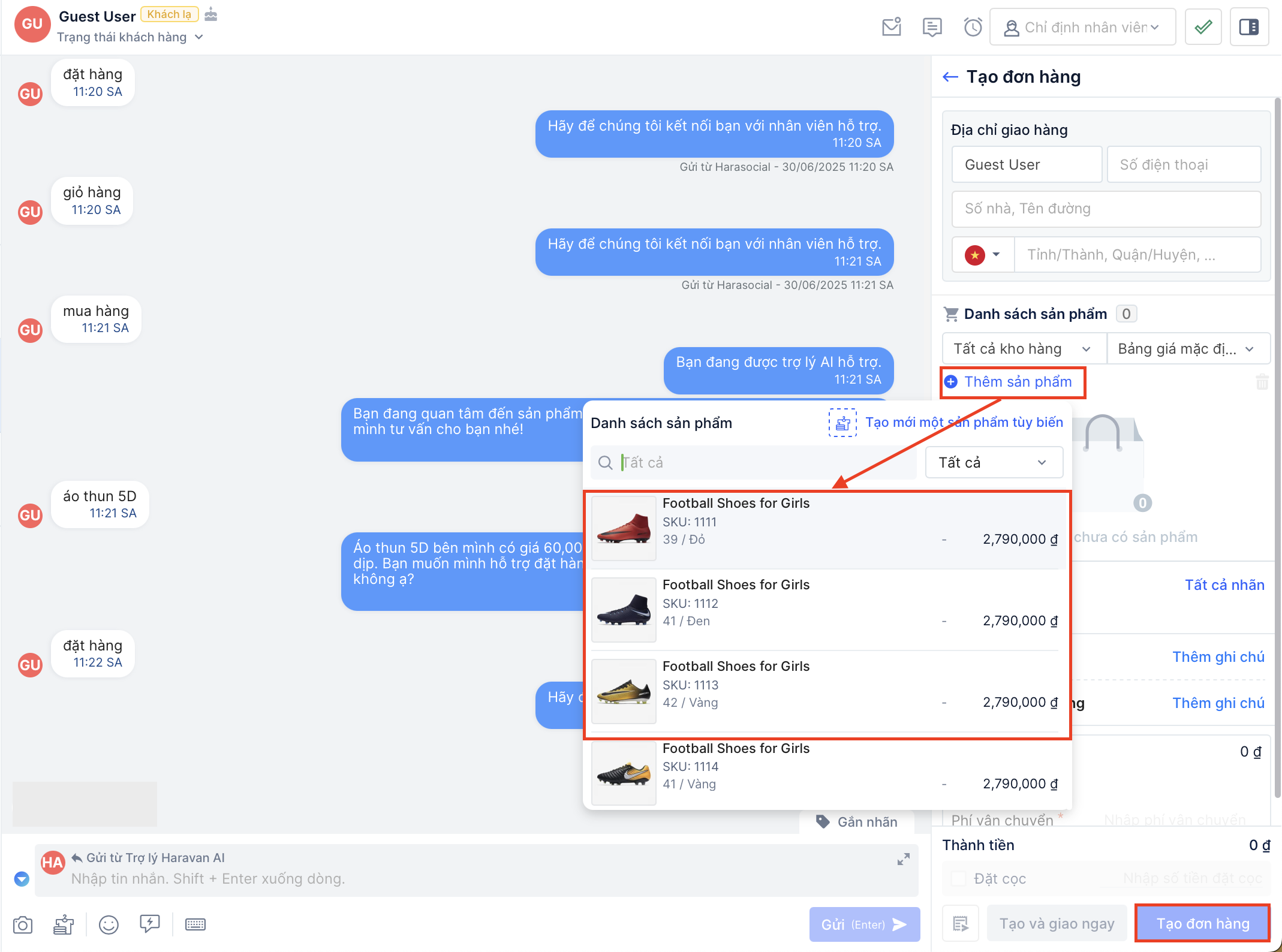 Khi khách hàng có nhu cầu mua sản phẩm, nhân viên có thể linh hoạt trong việc tự động thêm sản phẩm khách mong muốn vào giỏ hàng và gửi đơn hàng cho khách ngay trong hội thoại Harasocial: