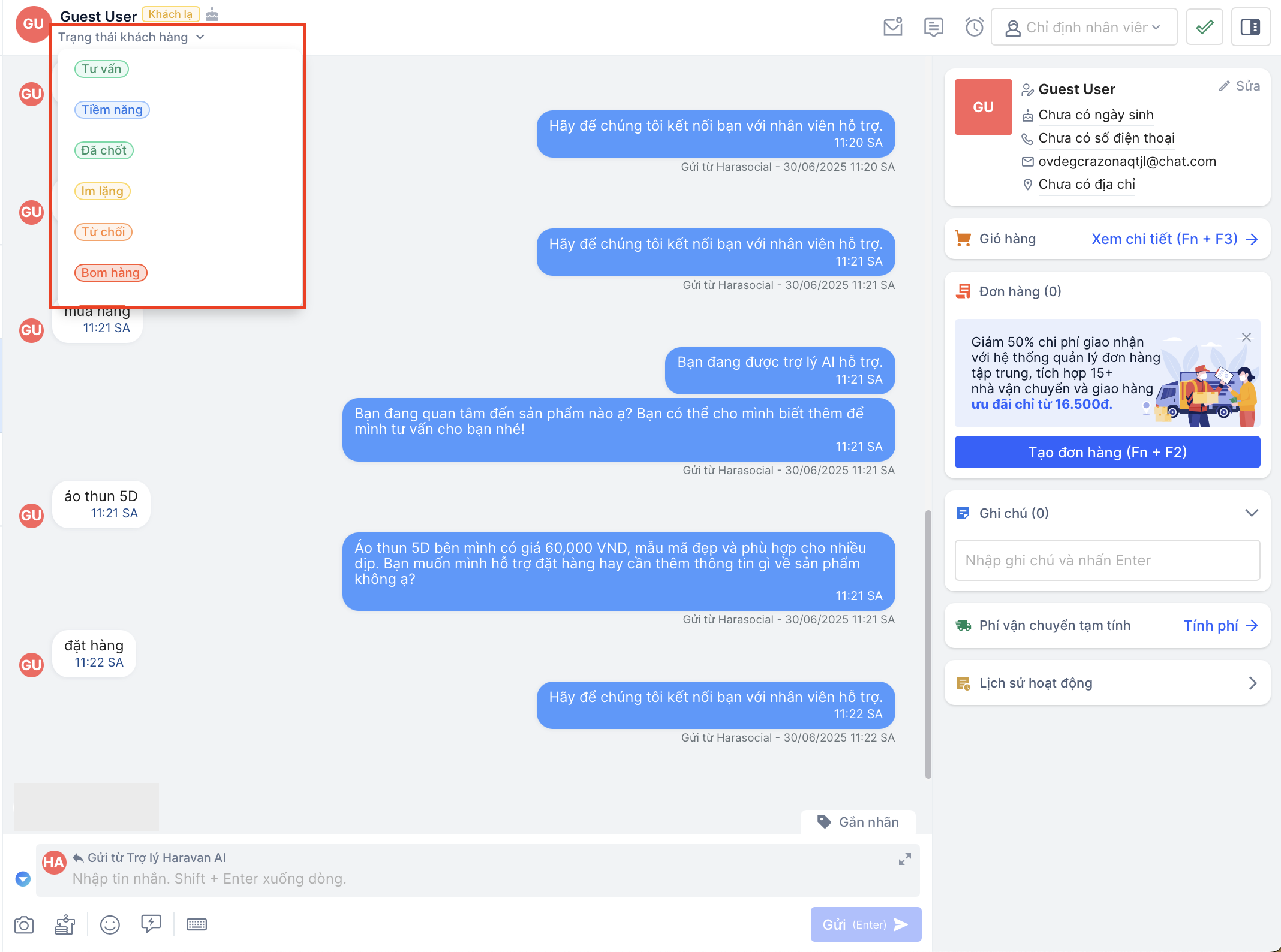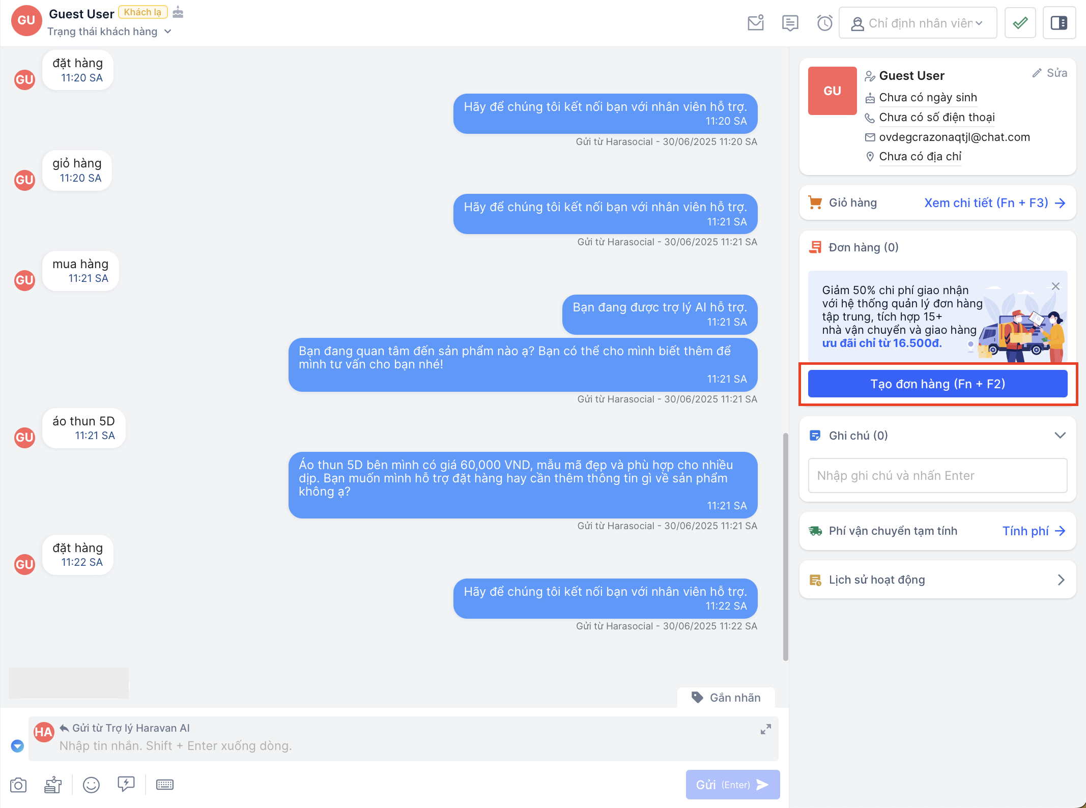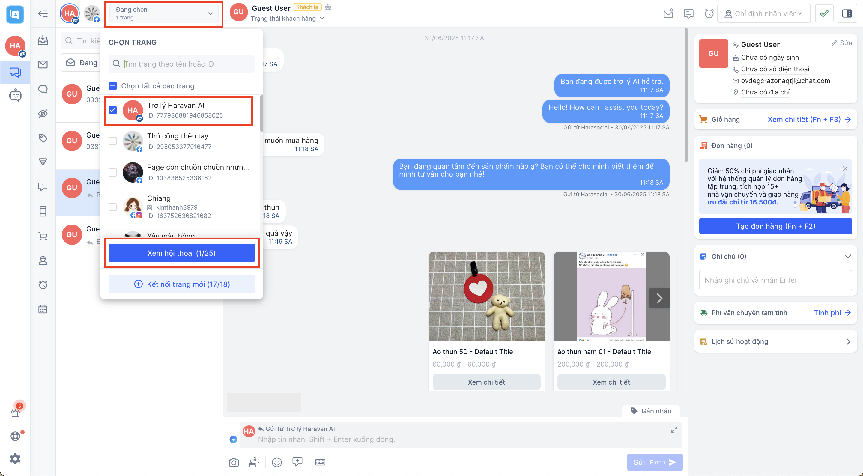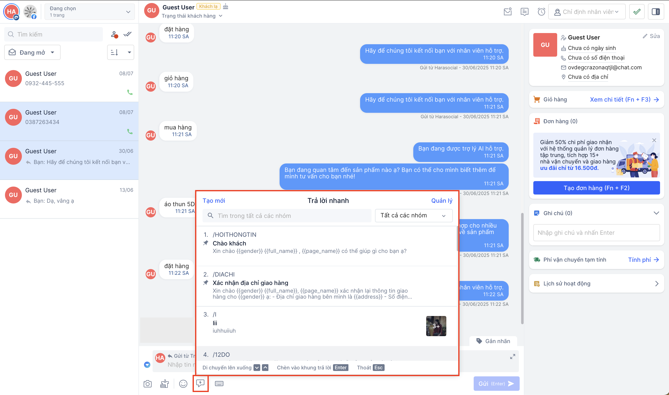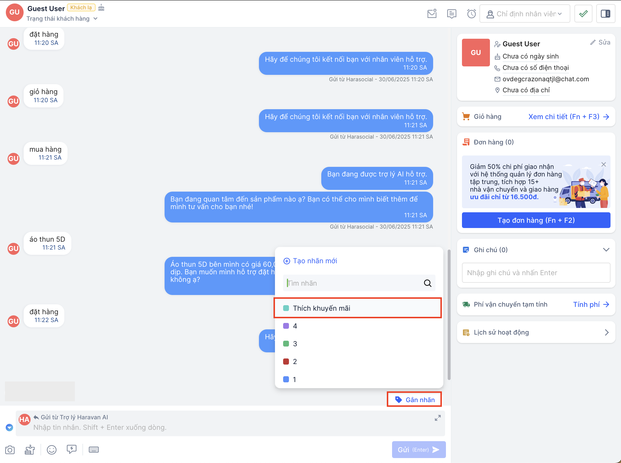 Khi khách hàng có nhu cầu mua sản phẩm, nhân viên có thể linh hoạt trong việc tự động thêm sản phẩm khách mong muốn vào giỏ hàng và gửi đơn hàng cho khách ngay trong hội thoại Harasocial: