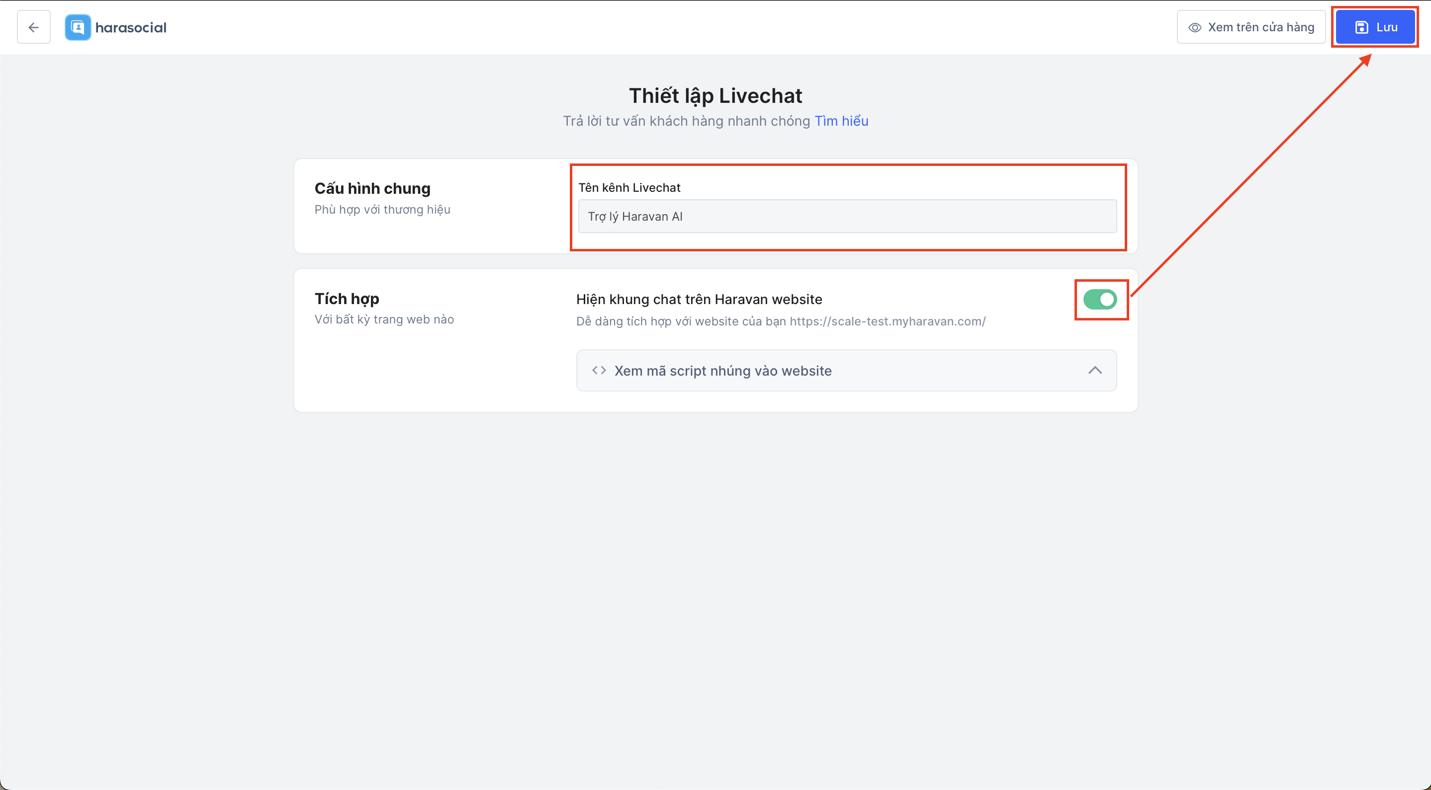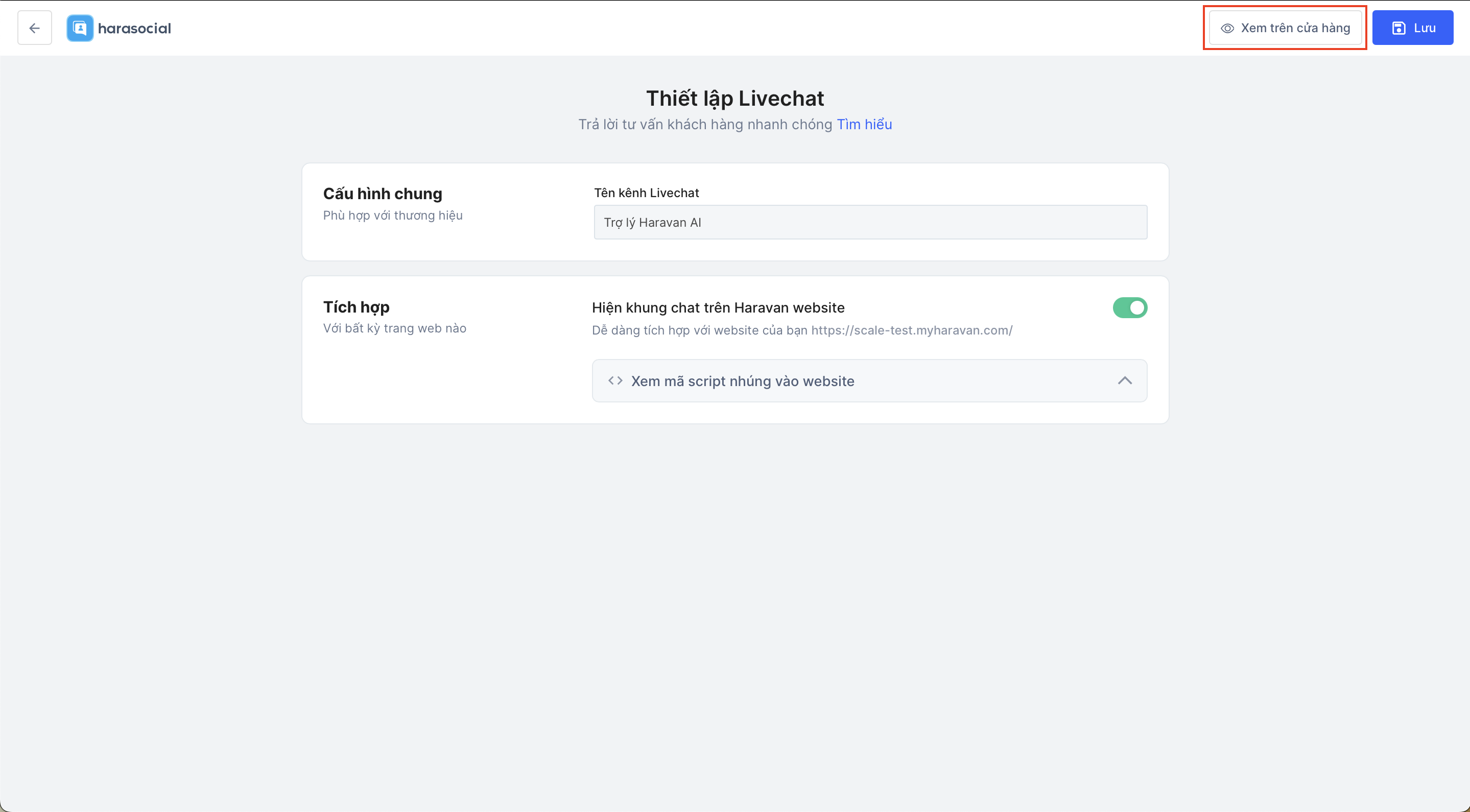 - Tại giao diện thiết lập Livechat sẽ hiện thị tên kênh Livechat (tên kênh website Haravan) mà bạn đang kinh doanh. Để kết nối, bạn chỉ cần nhấn vào nút "Lưu":