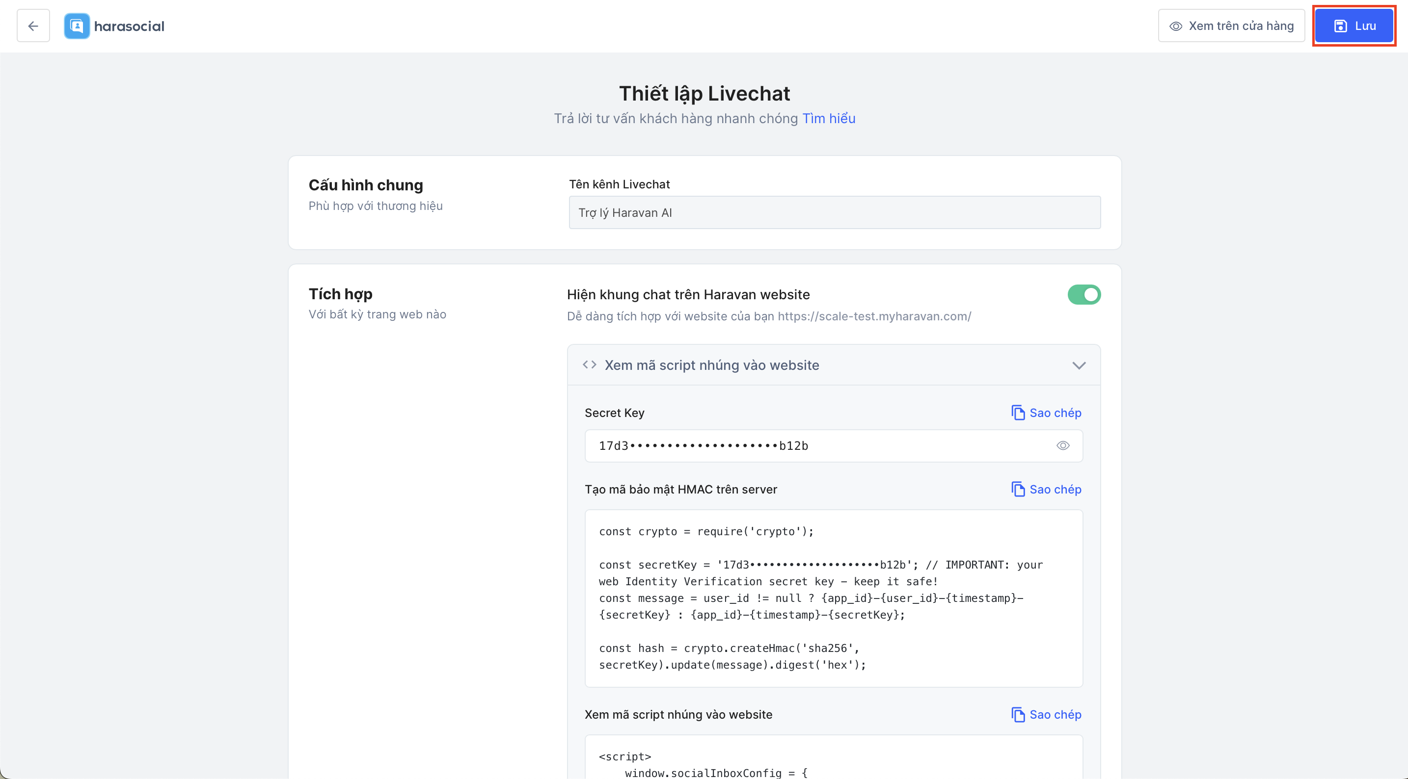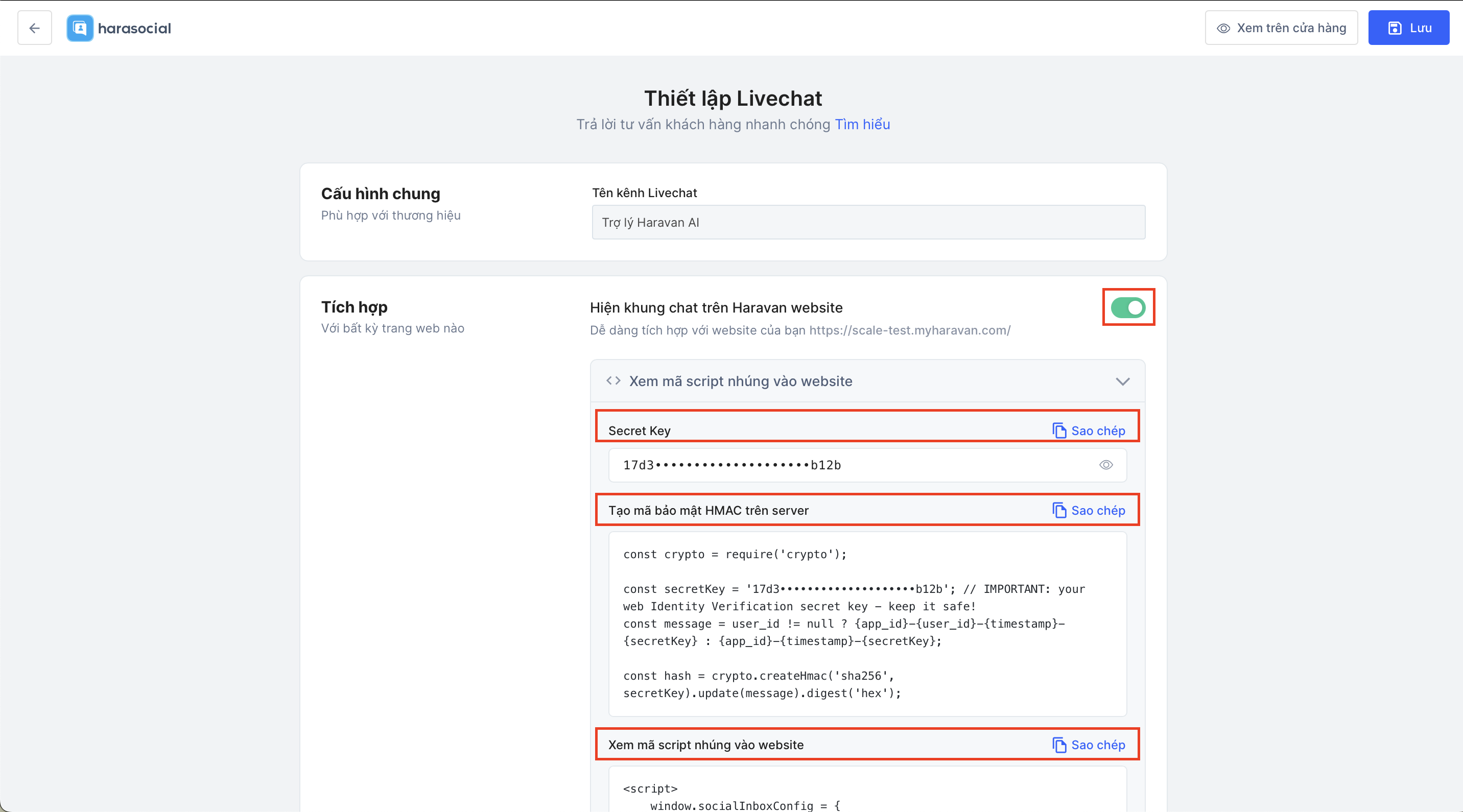 - Bật tính năng "Hiện khung chat trên Haravan website" và nhập các đoạn code nhúng vào website: