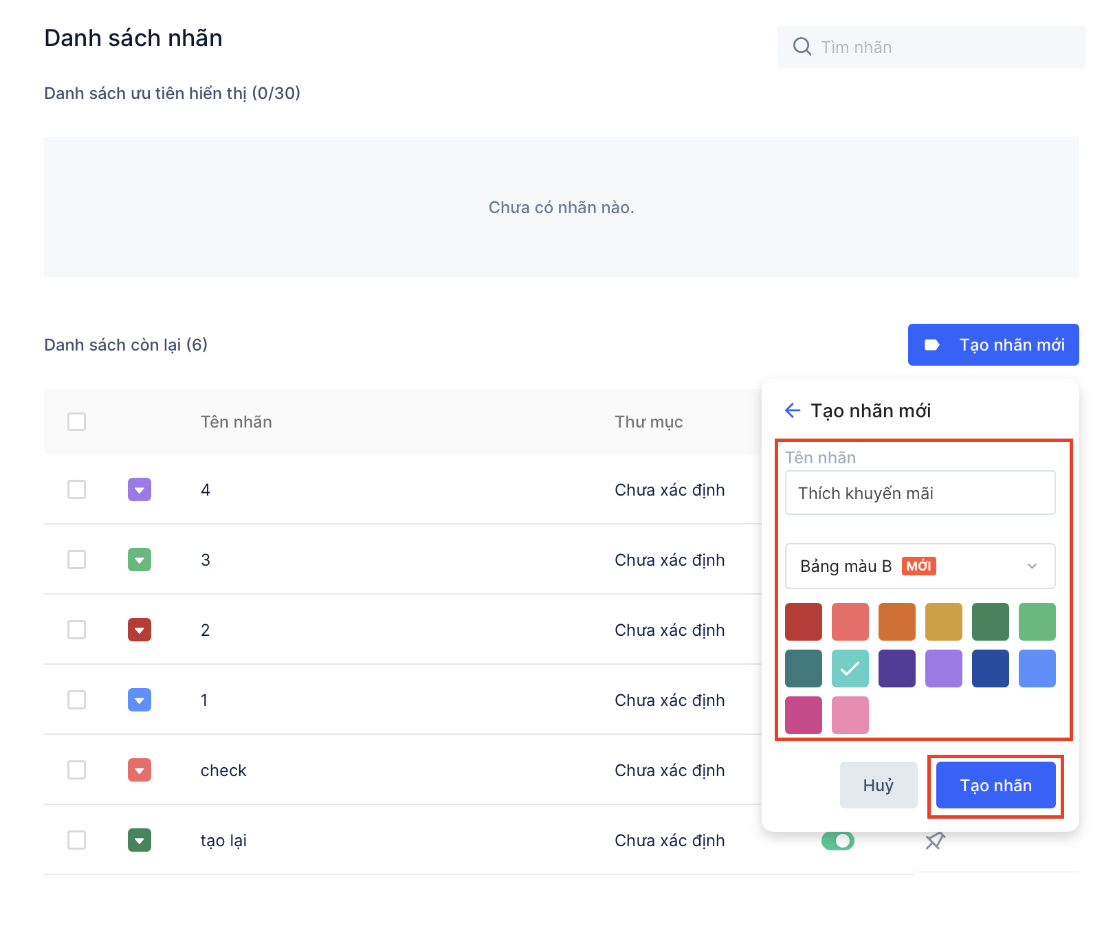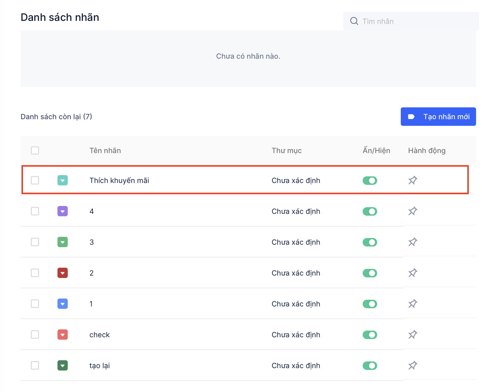 → Nhãn vừa được tạo sẽ được hiển thị ở "Danh sách còn lại", nếu muốn đưa nhãn lên "Danh sách ưu tiên", bạn cần bấm vào biểu tượng "Ghim" ở cột Hành động: