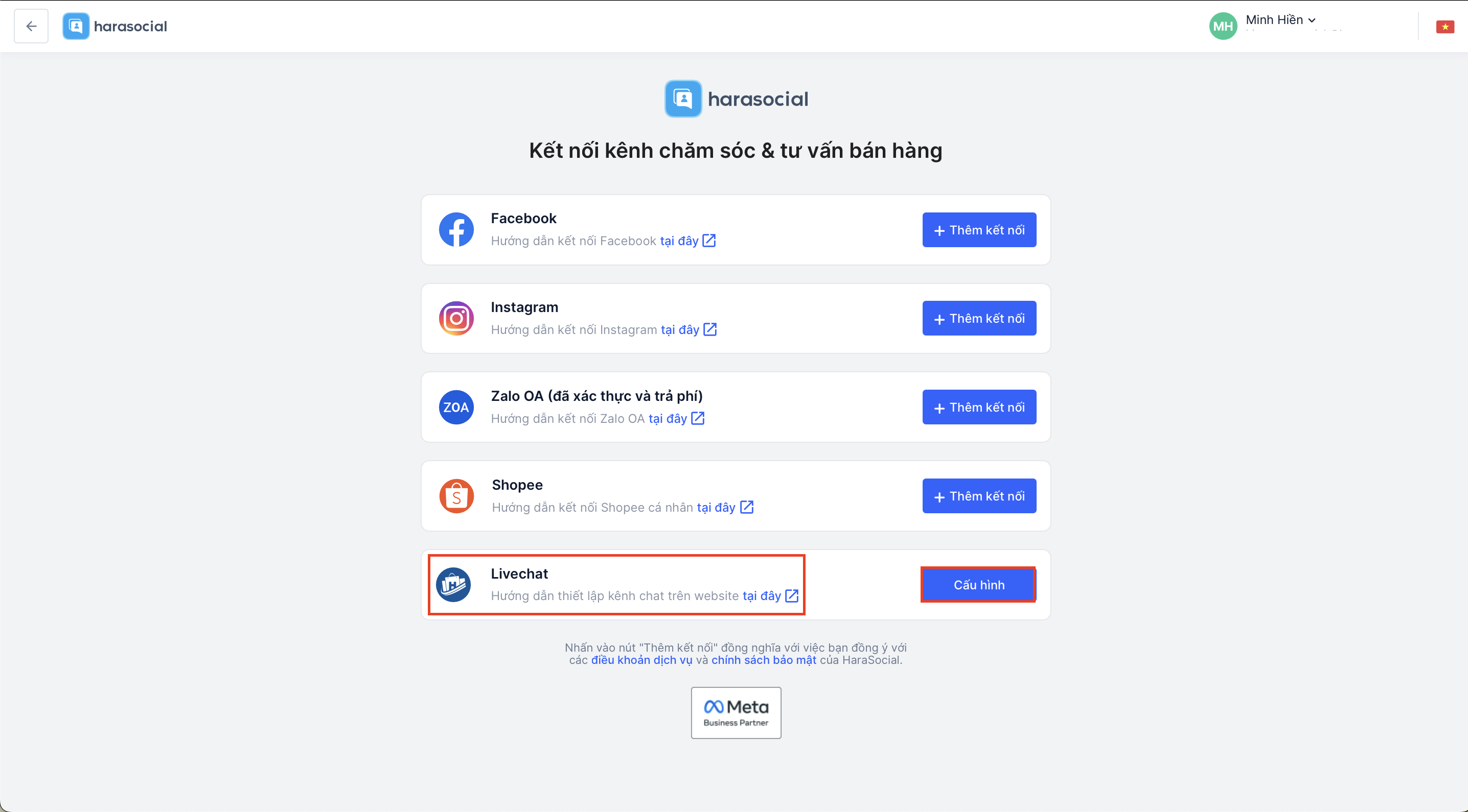 - Sau khi quay trở lại với giao diện Harasocial, bạn sẽ thấy kênh Livechat đã được thêm vào danh sách các kênh bán hàng: