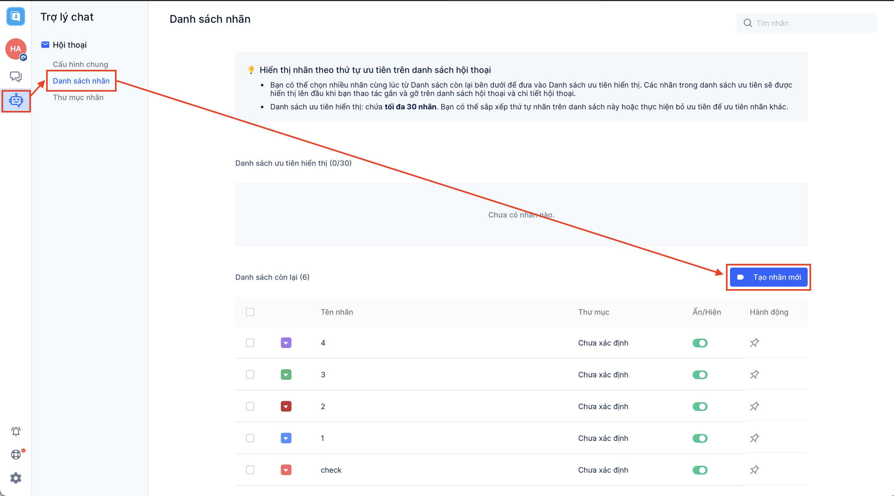 Để tạo danh sách các nhãn dán phân loại khách hàng, nhà kinh doanh truy cập vào biểu tượng "Trợ lý chat" ở thanh menu trên giao diện Harasocial → Sau đó chọn "Danh sách nhãn" và "Tạo nhãn mới":