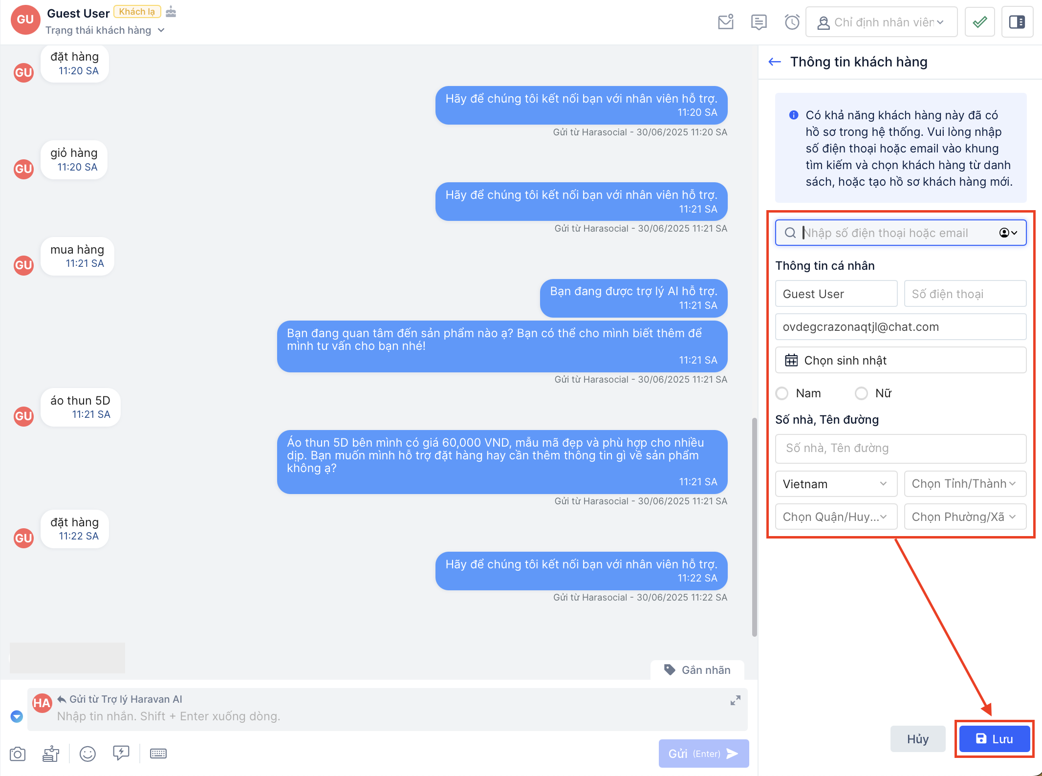 Khi một khách hàng nhắn tin trên website, tin nhắn đó sẽ được đồ về hệ thống Livechat của Harasocial. Tại đây, nhân viên bán hàng sẽ cần hỏi thông tin của người mua như họ tên, ngày sinh, địa chỉ, email, số điện thoại... và tạo hồ sơ cho khách hàng này. Hồ sơ của khách hàng sẽ được đồng bộ qua danh sách khách hàng tại trang quản trị MyHaravan: