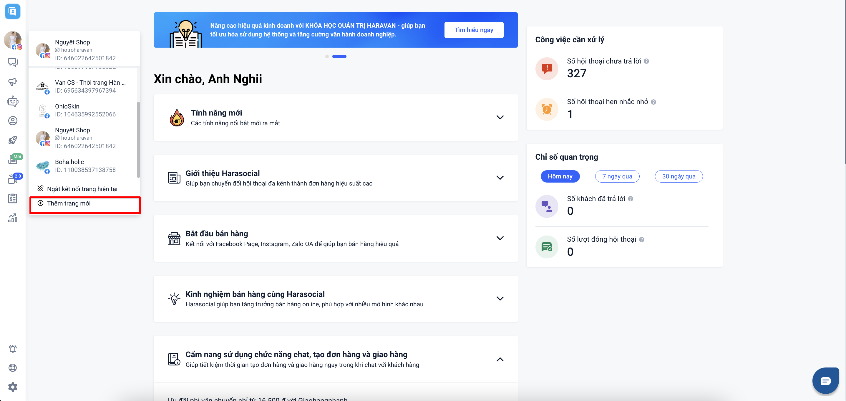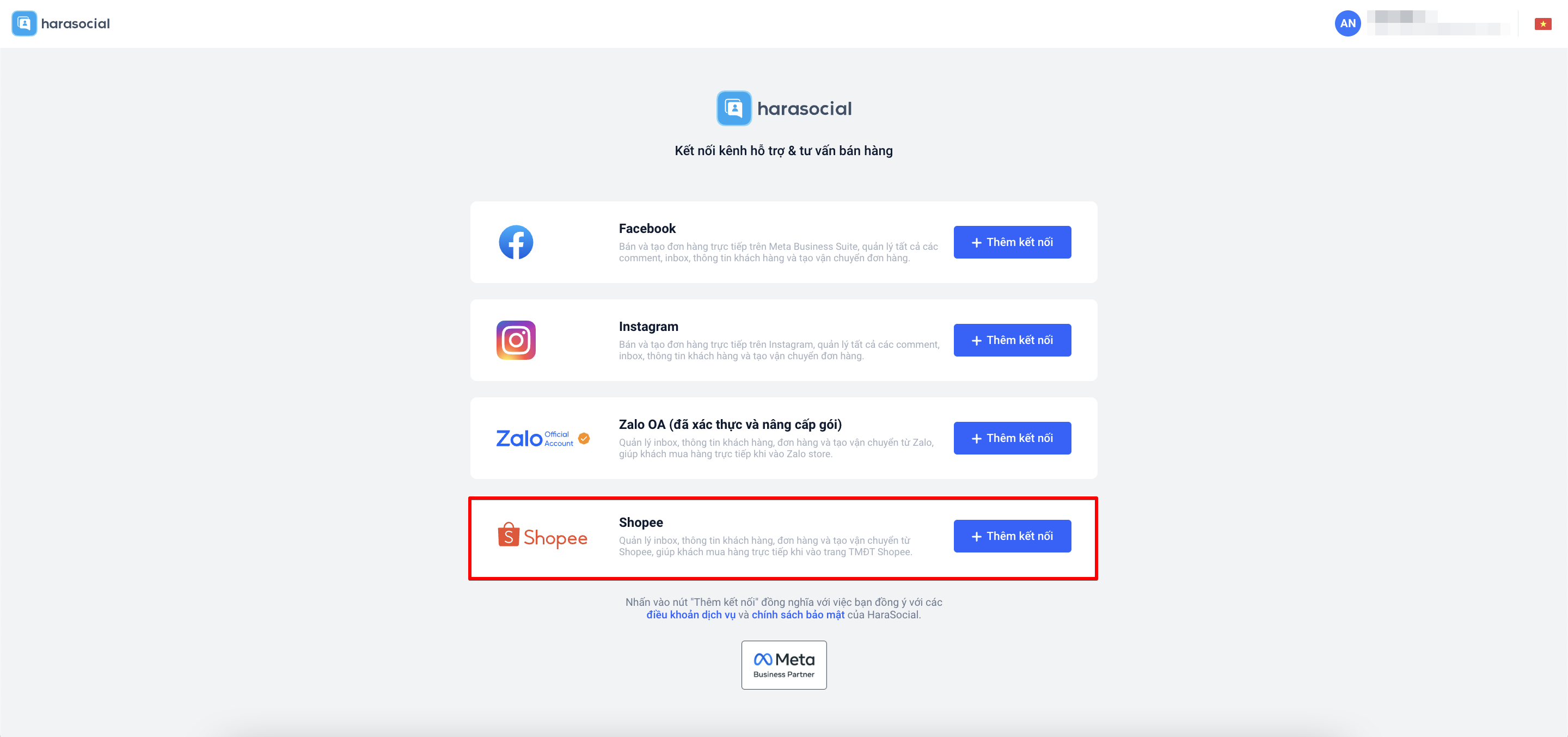 Sau khi bạn đã thực hiện đăng ký tài khoản Harasocial, bạn sẽ được chuyển đến trang kết nối page. Tại đây, bạn nhấp Thêm kết nối Shopee: