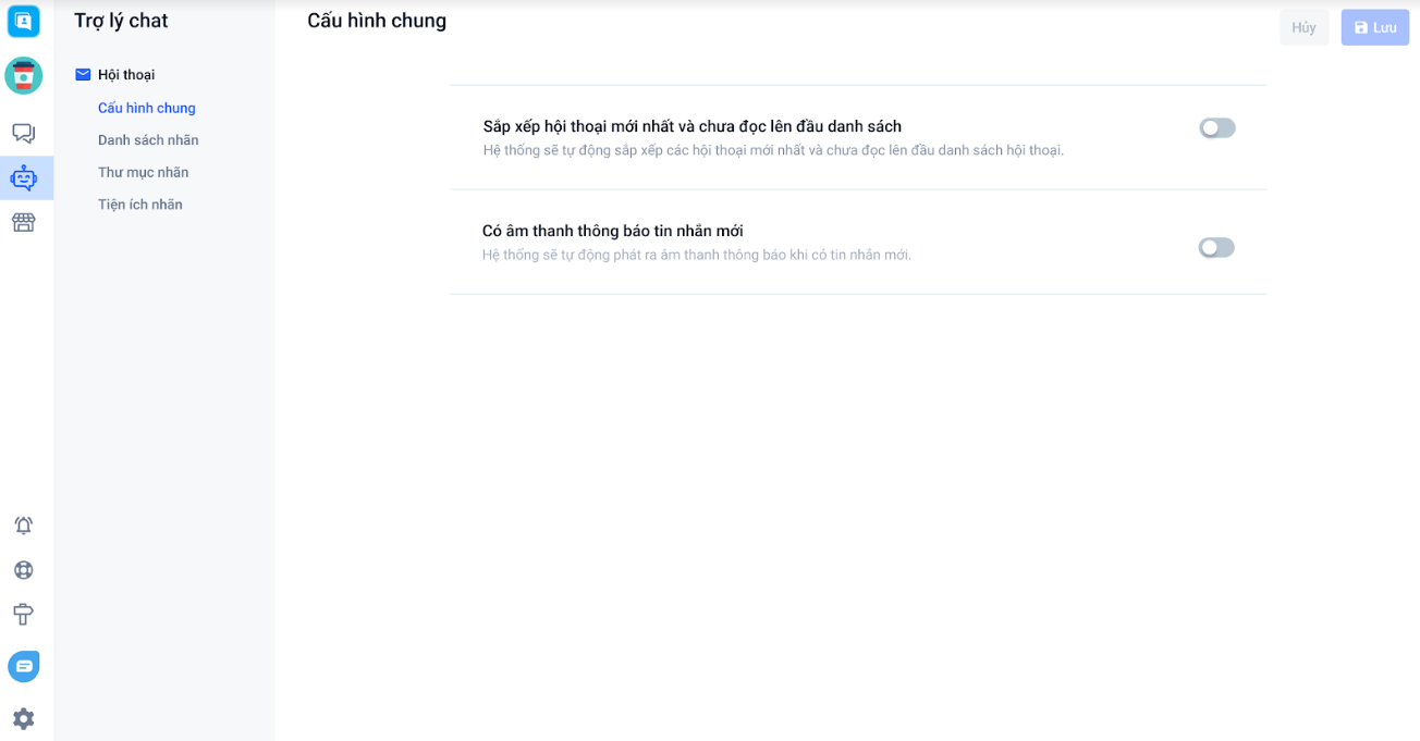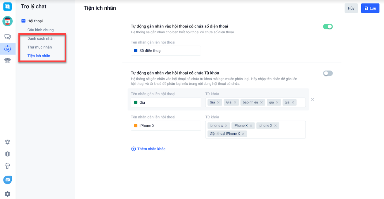 - Thiết lập nhãn hội thoại: bao gồm các nhãn sẽ gắn cho hội thoại khách hàng (danh sách nhãn, thư mục nhãn và tiện ích nhãn).