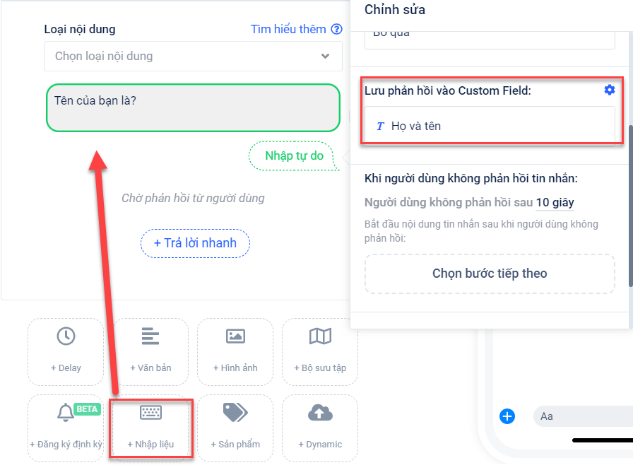 Trong lúc soạn thảo, chọn thẻ "+ Nhập liệu"→ nhập câu hỏiđể khách hàng để lại thông tin → Chọn Custom field để lưu trữ lại câu trả lời của khách hàng.