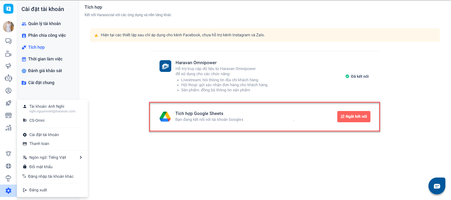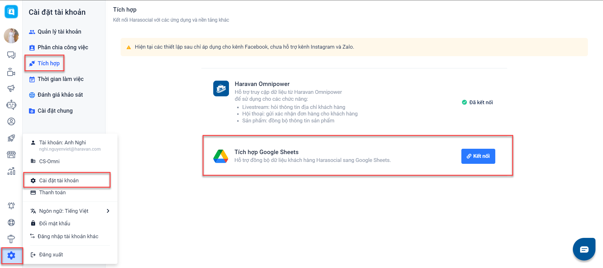 Để sử dụng, bạn cần đăng nhập vào Harasocial → Chọn mục Cài đặt tài khoản → Tích hợp → Kết nối: