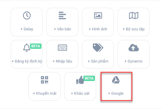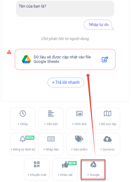 Sau khi đã tích hợp, toàn bộ các khu vực soạn thảo nội dung chatbot sẽ có thêm mục**"+Google":**