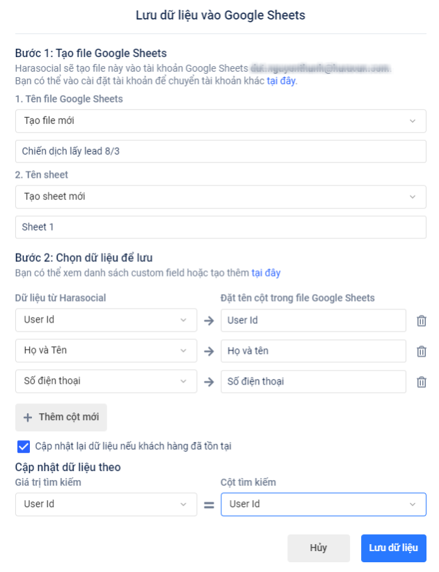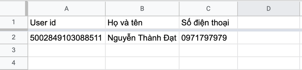 Hệ thống sẽ tìm kiếm theo thông tin của khách hàng để cập nhật các thông tin thay đổi. Khuyến cáo nên tìm kiếm theo giá trị "User Id" - đây cũng là lí do vì sao lúc đầu bạn nên cần truyền "User Id" ra 1 cột trong file Google Sheets.
