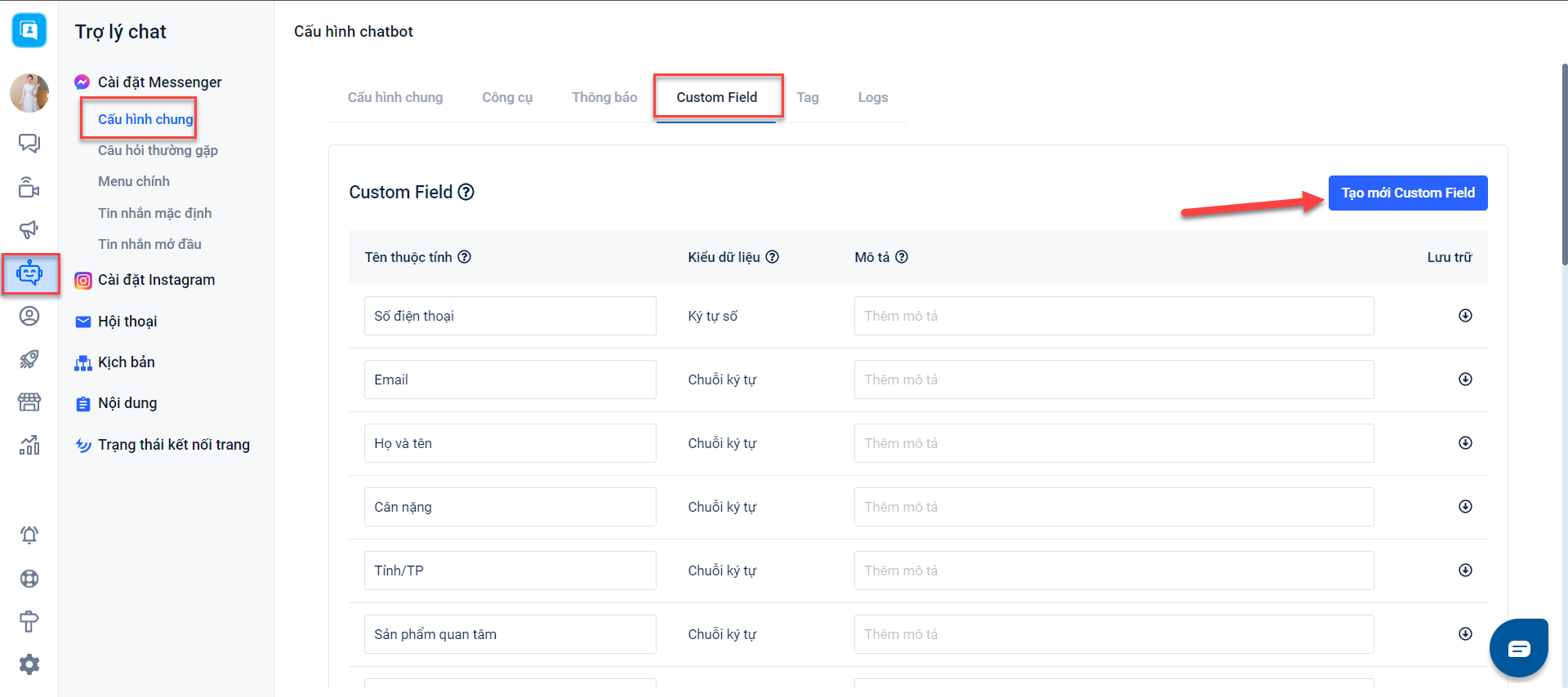 Custom field là nơi để lưu trữ các dữ liệu từ khách hàng mà bạn thu thập được trong trình khách hàng tương tác với chatbot. Bạn cần tạo trước các trường thông tin khách hàng, cách tạo mới bạn có thể xem thêm tại đây.