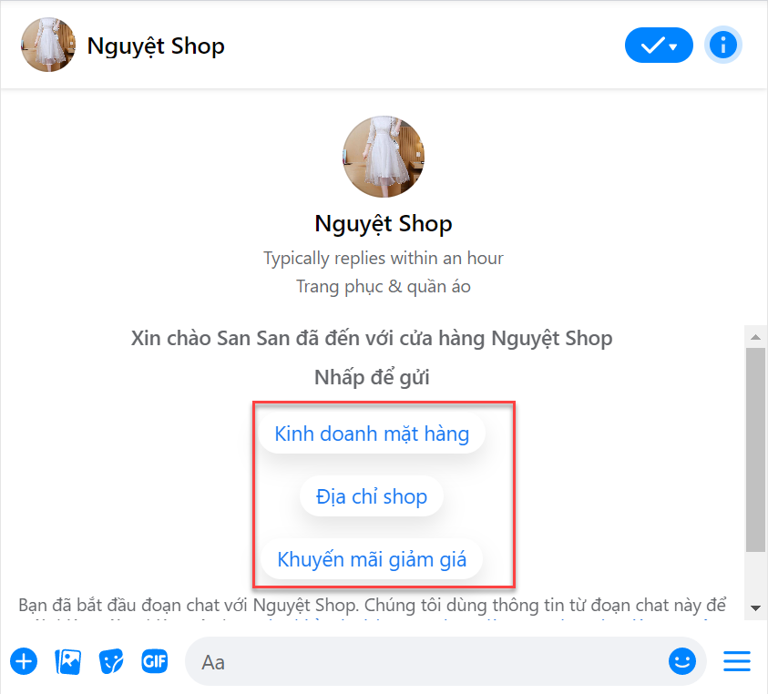 - Các câu hỏi thường gặp chỉ xuất hiện trên Messenger của những người chưa từng chat với Fanpage của bạn. Bạn có thể trải nghiệm bằng cách chat với chính Fanpage của bạn và xóa hết nội dung đã chat: