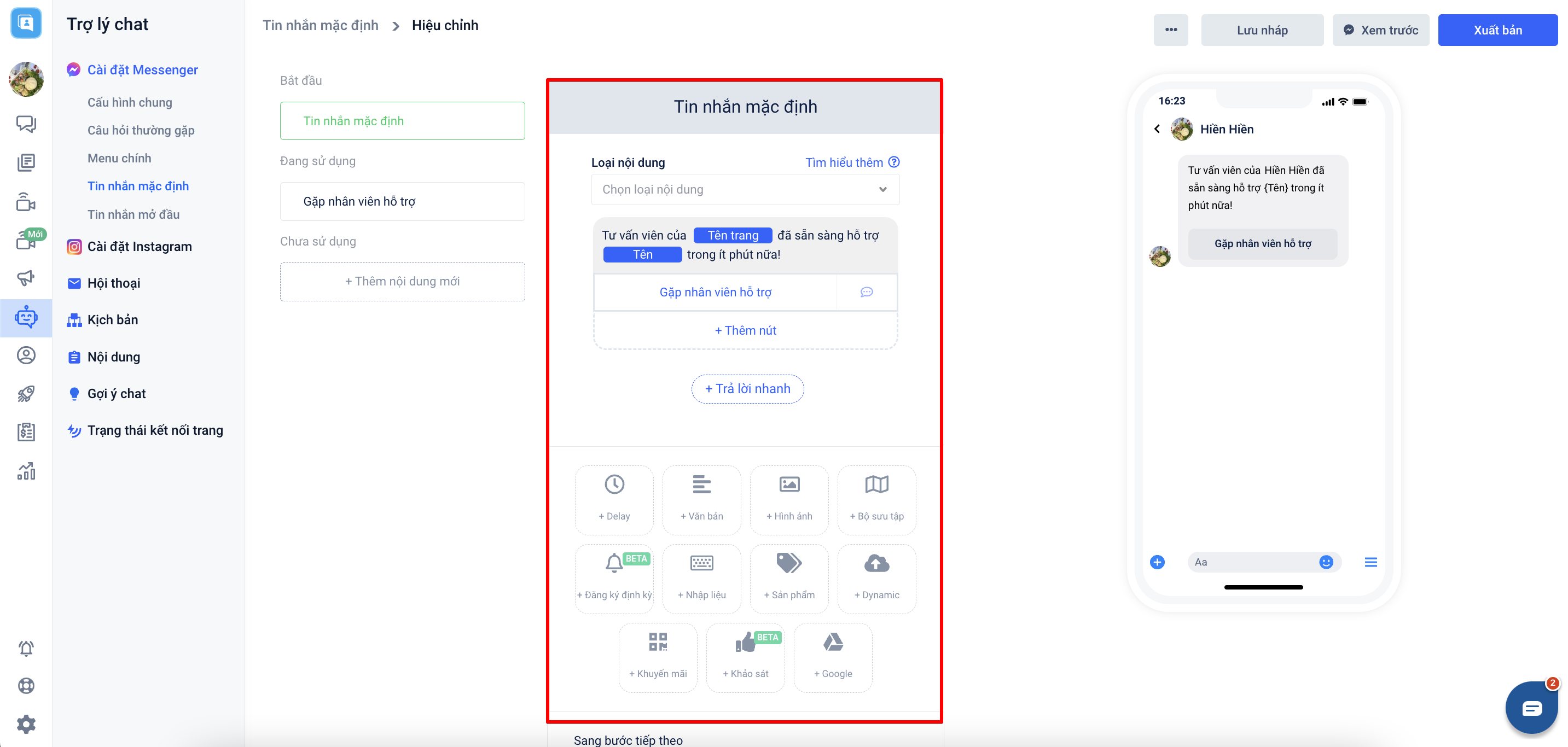 - Bước 2: Sau đó bạn cần thiết lập nội dung tin nhắn mặc định → nhấn Xuất bản: