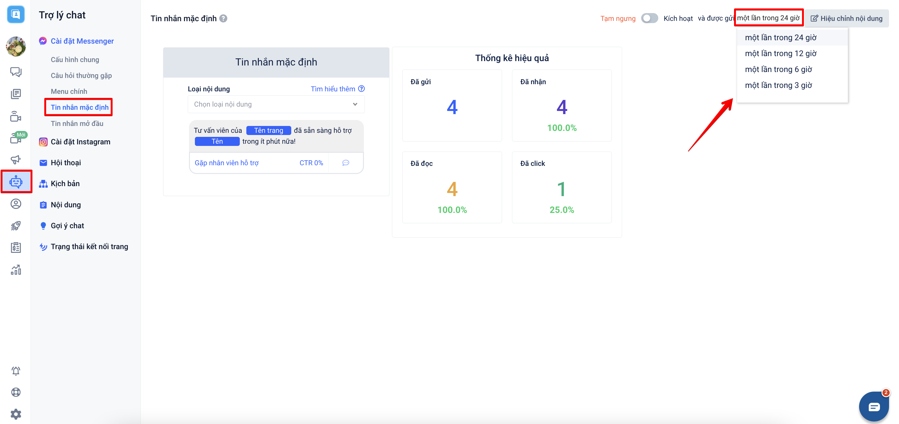 - Trong 24h kế tiếp tính từ tin nhắn cuối cùng của khách, nếu khách hàng chủ động quay lại nhắn tin với Fanpage thì họ sẽ không nhận được tin nhắn mặc định.