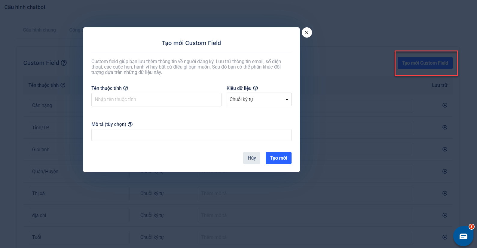 Custom field là 1 trường dữ liệu giúp bạn lưu trữ thông tin của khách hàng, chẳng hạn như email, số điện thoại, địa chỉ, ngành nghề và bất cứ thứ gì bạn muốn khách hàng cung cấp cho bạn trong khi chat.