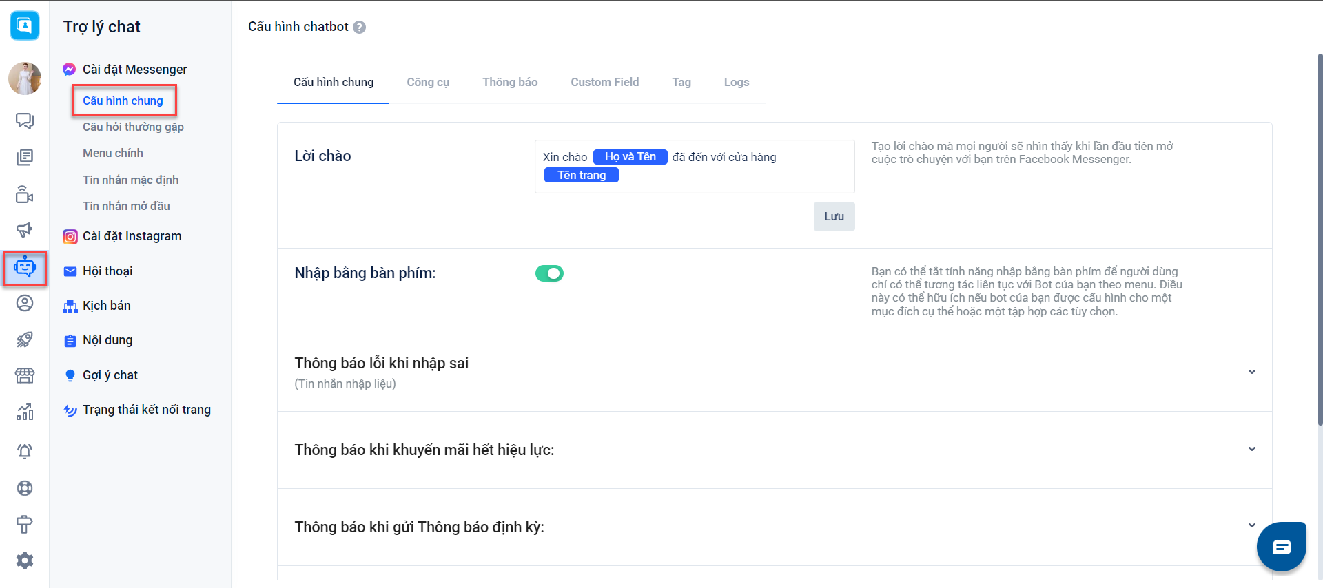 Với mục cấu hình chung này sẽ tập trung trong các bước để thiết lập một chatbot, tại đây bạn có thể cài đặt được lời chào, nội dung thông báo, công cụ cho phép sao chép các kịch bản mẫu. Hỗ trợ hiệu quả cho việc tương tác với khách hàng.