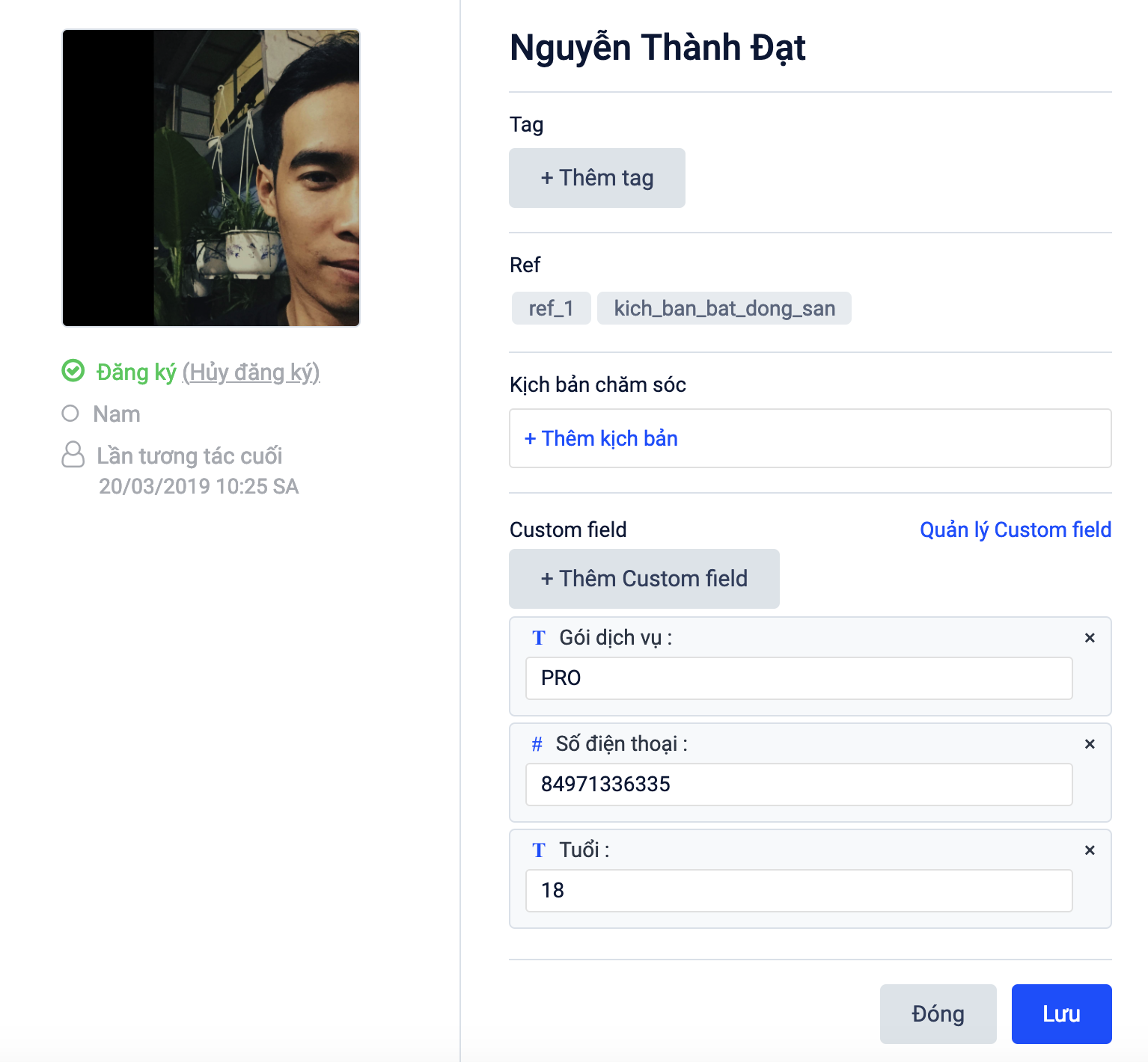 Custom field là 1 trường dữ liệu giúp bạn lưu trữ thông tin của khách hàng, chẳng hạn như email, số điện thoại, địa chỉ, ngành nghề và bất cứ thứ gì bạn muốn khách hàng cung cấp cho bạn trong khi chat. Bạn có thể xem các thông tin này cụ thể trong từng khách hàng: