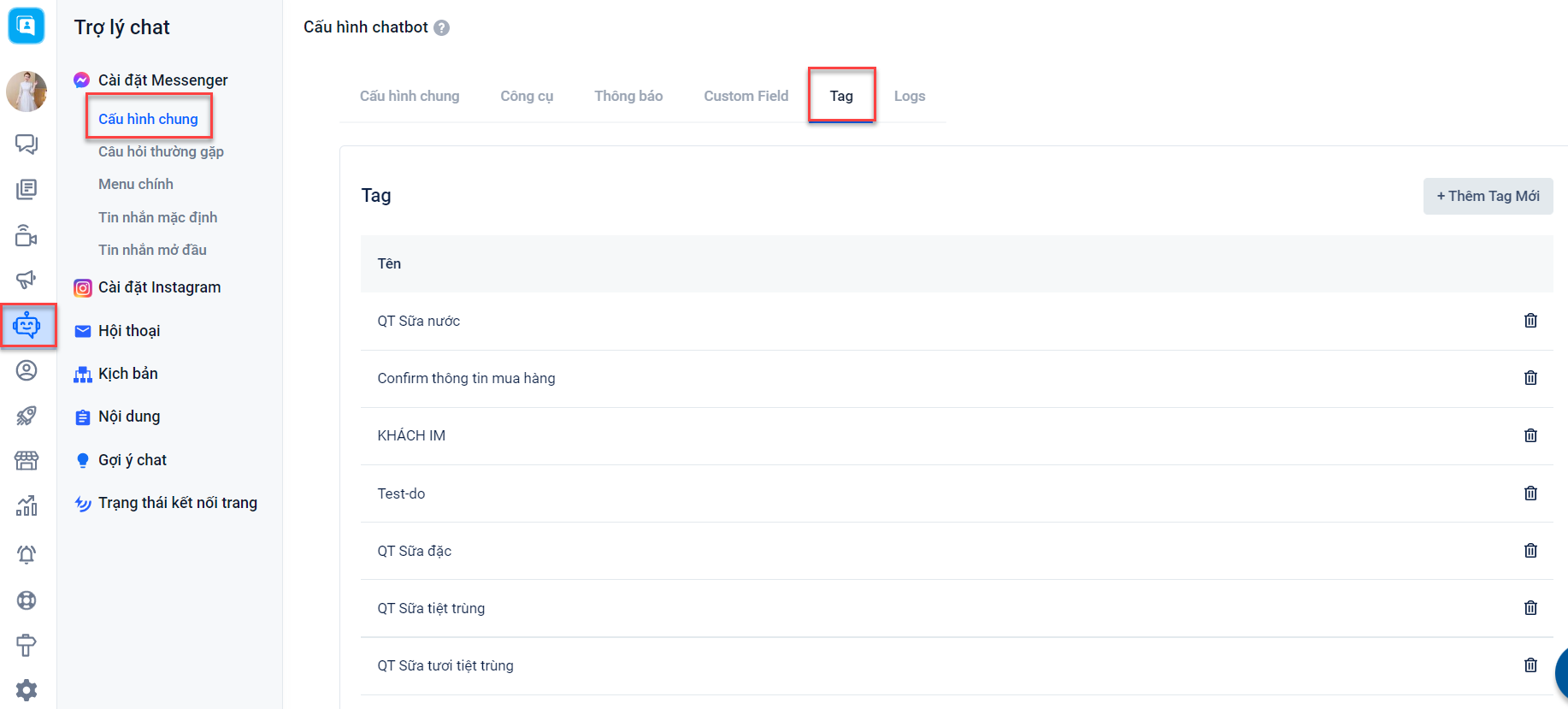 Khi bạn thiết lập một kịch bản và đính kèm một hành động Thêm tag, sau đó khi chatbot hoạt động thì những nhãn (tag) từ chatbot đó đều quản lý tại đây. Bạn có thể thêm mới hoặc xóa các tag đã tạo.